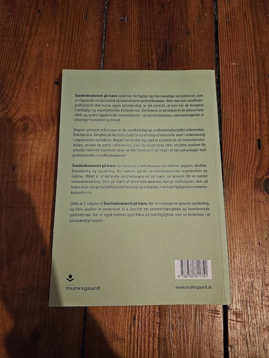 Sundhedsvæsenet på tværs tilbyder en nuanceret gennemgang af de faglige og menneskelige kompetencer, der er essentielle for at navigere i et komplekst og specialiseret sundhedsvæsen. Bogen understreger vigtigheden af tværfaglige og organisatoriske færdigheder, såvel som indsigt i de økonomiske vilkår og regulerende rammer, der præger et overvejende offentligt finansieret sundhedsvæsen. Henvendt primært til uddannelser inden for sundhedsprofessionelle professionsbachelorer, fungerer bogen som et redskab til at forstå sundhedsvæsenets aktører, opgaver, struktur, finansiering og ledelse. Den er også relevant for studerende fra naturvidenskabelige, sociale og andre fagområder, der enten træder ind i sundhedsvæsenet eller vil samarbejde tæt med sundhedsprofessionelle. I denne 2. udgave er der foretaget en generel opdatering, med omskrevne kapitler om koordinering af patientforløb samt et øget og selvstændigt fokus på tværfaglighed.