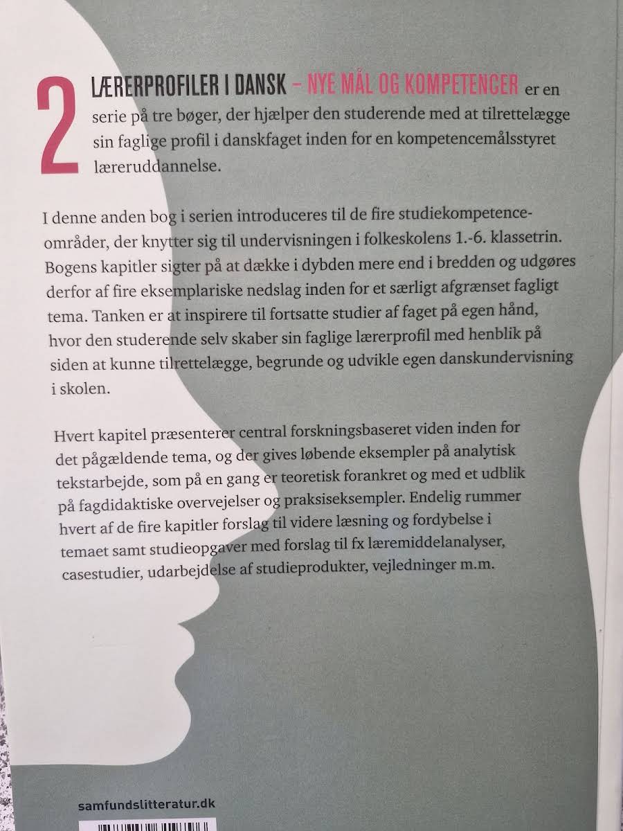 "Lærerprofiler i dansk – 1.-6. klassetrin" er en indledende og struktureret guide for lærerstuderende med fokus på de centrale kompetenceområder i danskundervisningen på de tidlige klassetrin. I første udgave fra 2014 præsenterer Niels Mølgaard et solidt teoretisk fundament, der hjælper med at udvikle evnen til at planlægge, begrunde og videreudvikle egen undervisning. Med en systematisk tilgang kombineres centrale teoretiske redskaber med praktiske eksempler, der tydeliggør, hvordan forskningsbaseret viden kan omsættes til daglig didaktisk praksis. Bogens kapitler rummer både analytisk tekstarbejde og fagdidaktiske overvejelser, der inspirerer til både individuel fordybelse og praktisk anvendelse. Derudover indeholder hvert kapitel forslag til videre læsning og studieopgaver, som bidrager til en helhedsorienteret forståelse af danskfaget. Denne velstrukturerede bog hjælper lærerstuderende med at opbygge en faglig profil, der sikrer en sammenhængende og reflekteret tilrettelæggelse af danskundervisningen i folkeskolen.