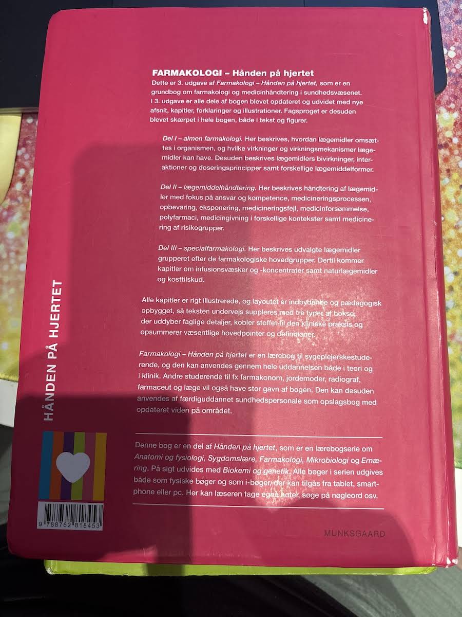 3. udgave af Farmakologi – Hånden på hjertet præsenterer en omfattende og ajourført introduktion til farmakologi og korrekt håndtering af lægemidler. Med 714 sider byder bogen på nye afsnit, kapitler og illustrationer, der hver især understøtter fagsproget og den kliniske relevans. Bogen er inddelt i tre hoveddele, hvor Del I omhandler almen farmakologi med fokus på lægemidlers optagelse, omsætning og virkningsmekanismer i kroppen. Del II fokuserer på modern medicinhåndtering, med vægt på ansvarsområder, doseringsprincipper og forebyggelse af medicineringsfejl i sundhedsvæsenet. Del III dykker ned i specialfarmakologi og giver et detaljeret indblik i de forskellige lægemiddelgruppers særlige egenskaber, herunder praktiske betragtninger om infusionsvæsker, naturlægemidler og kosttilskud. Den pædagogiske opbygning med fokuserede bokse, der fremhæver nøgleinformation og kliniske perspektiver, gør bogen særlig velegnet både til studerende og fagfolk.