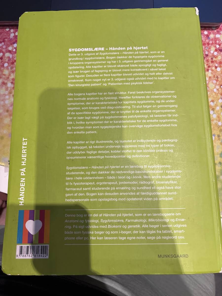 Dette er 3. udgave af grundbogen Sygdomslære – Hånden på hjertet. I denne opdaterede version er hele bogen finpudset sprogligt og fagligt, og flere kapitler er blevet udvidet, omskrevet eller fået fornyet indhold. Især er der tilføjet to nye kapitler om Den kirurgiske patient samt Patienten med psykisk lidelse, hvilket giver en bredere indsigt i kliniske udfordringer. Bogen opbygger hvert kapitel med en fast struktur, hvor der først fokuseres på den normale anatomi og fysiologi, hvorefter de karakteristiske observationer, symptomer og de nødvendige diagnostiske undersøgelser bliver gennemgået. Herefter tilbydes en dybdegående redegørelse for de specifikke sygdomme knyttet til hvert organsystem med særlig vægt på patofysiologi og sygdomsforløb. Sygdomslære – Hånden på hjertet fungerer som et uvurderligt redskab for sygeplejerskestuderende og andre sundhedsprofessionelle. Med sine 712 sider dækker bogen de væsentligste basiskundskaber i sygdomslære og giver et solidt fundament både til teoretisk studie og til klinisk praksis.