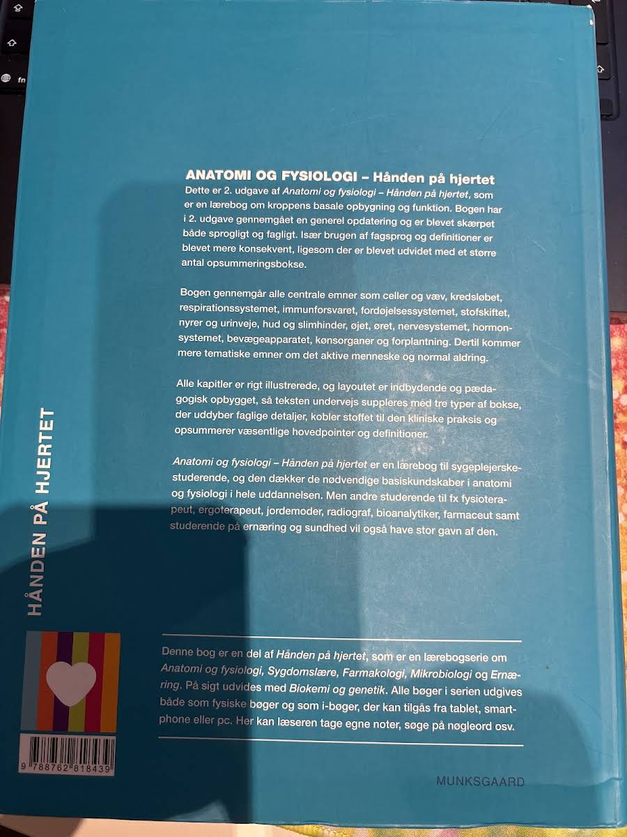Anatomi og fysiologi – hånden på hjertet (2. udgave) giver en grundig og opdateret introduktion til kroppens struktur og funktion. Denne udgave har fået et skærpet sprog og konsekvent anvendelse af fagsprog og definitioner, der sikrer en klar og præcis formidling af stoffet. Bogen gennemgår alle centrale emner, herunder celler og væv, kredsløb, respirationssystemet, immunforsvaret, fordøjelsessystemet, stofskiftet, nyrer og urinveje, hud og slimhinder, øjet og øret, nervesystemet, hormonsystemet, bevægeapparatet samt kønsorganer og forplantning. Derudover berøres tematiske aspekter som det aktive menneske og normal aldring. Med rigt illustrerede kapitler og et indbydende layout, der understøttes af tre typer bokse til uddybning af faglige detaljer, knytter bogen teorien til klinisk praksis og opsummerer de vigtigste hovedpointer og definitioner. Trods sit primære fokus på sygeplejerskestuderende, vil også studerende inden for andre sundhedsprofessioner finde stor gavn af denne velstrukturerede lærebog.
