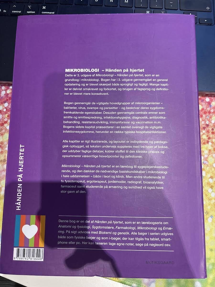 I 3. udgave af Mikrobiologi – Hånden på hjertet er grundbogen i mikrobiologi blevet gennemgået med en omfattende faglig og sproglig opdatering. Mange kapitler er revideret, forkortet og tilpasset med et mere konsekvent fagsprog, så læseren oplever en strømlinet og moderne tilgang til stoffet. Bogen dykker ned i de væsentligste mikroorganismer – herunder bakterier, virus, svampe og parasitter – og belyser deres rolle i sygdomsprocesser. Centrale temaer som smitte, infektionshygiejne, diagnostik, antibiotikabehandling, resistensudvikling, immunforsvar og vaccination behandles grundigt og præcist. Med et indbydende layout, rige illustrationer og specialdesignede bokse, der både forklarer faglige detaljer, relaterer stoffet til klinisk praksis og fremhæver hovedpointer, bliver bogen en uvurderlig ressource. Den er skræddersyet til sygeplejerskestuderende, men er også relevant for studerende inden for fysioterapi, ergoterapi, jordemoder, radiografi, bioanalytik, farmaci samt ernæring og sundhed.