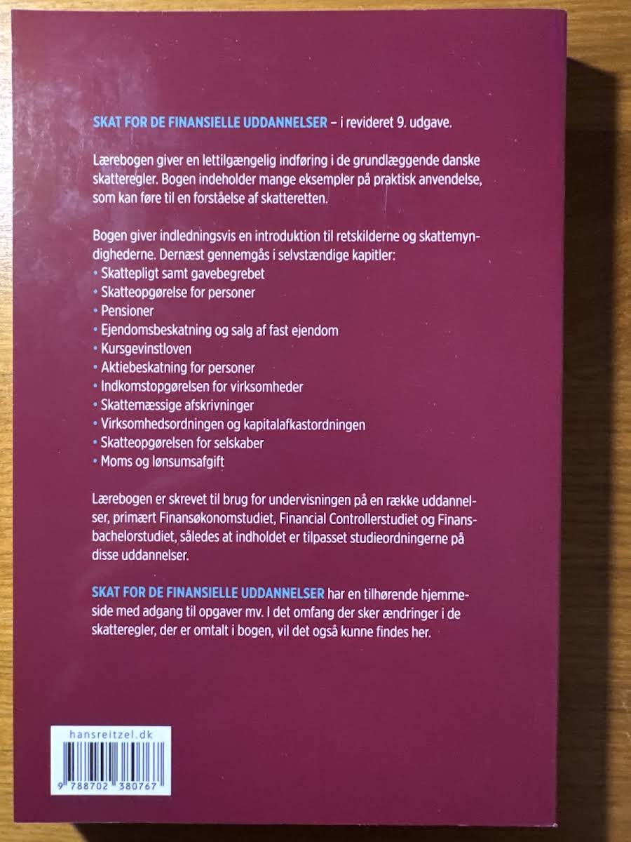 Lærebogens 9. udgave er opdateret med de nyeste ændringer i lovgivningen og præsenterer en overskuelig introduktion til de centrale danske skatteregler. Bogen er designet med henblik på undervisningen på flere finansielle uddannelser, herunder Finansøkonomstudiet, Financial Controller-studiet og Finansbachelorstudiet. Bogen starter med en grundig gennemgang af retskilder og de skattemyndigheder, som spiller en central rolle i skatteretten. Herefter uddybes emner som skattepligt, opgørelse af skat samt ejendomsbeskatning og salg af fast ejendom. Læseren får desuden indblik i kursgevinstloven og aktiebeskatning. Endvidere behandler bogen indkomstopgørelsen for virksomheder, skattemæssige afskrivninger, virksomhedsordningen og kapitalafkastordningen. Der gives også en klar introduktion til pensioner, moms og lønsumsafgift med mange praktiske eksempler, der gør det lettere at forstå og anvende skatteretlige principper i praksis.