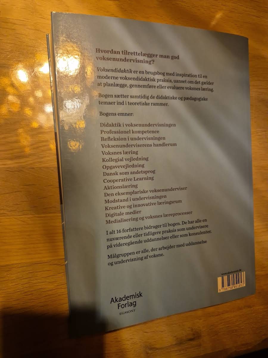 Hvordan tilrettelægger man en engagerende voksenundervisning? Voksendidaktik er en brugsbog, der tilbyder konkrete redskaber og inspiration til, hvordan man planlægger, gennemfører og evaluerer læringsforløb for voksne. Bogen sætter moderne didaktiske og pædagogiske temaer ind i klare teoretiske rammer, så du både får overblik og detaljeret indsigt. Bogen behandler emner som Didaktik i voksenundervisningen, Professionel kompetence, Refleksion i undervisningen, Voksenunderviserens handlerum og Voksnes læring. Derudover tages der også fat på centrale aspekter som Kollegial vejledning, Opgavevejledning, Dansk som andetsprog, Cooperative Learning, Aktionslæring, Kreative og innovative læringsrum, digitale medier samt medialisering og voksnes læreprocesser. Med forfatternes solide erfaring fra underviserpraksis på videregående uddannelser henvender bogen sig til alle, der arbejder med voksenuddannelse og undervisning. Voksendidaktik er derfor et uundværligt redskab for dem, der ønsker at styrke den pædagogiske praksis med et velfunderet teoretisk grundlag.