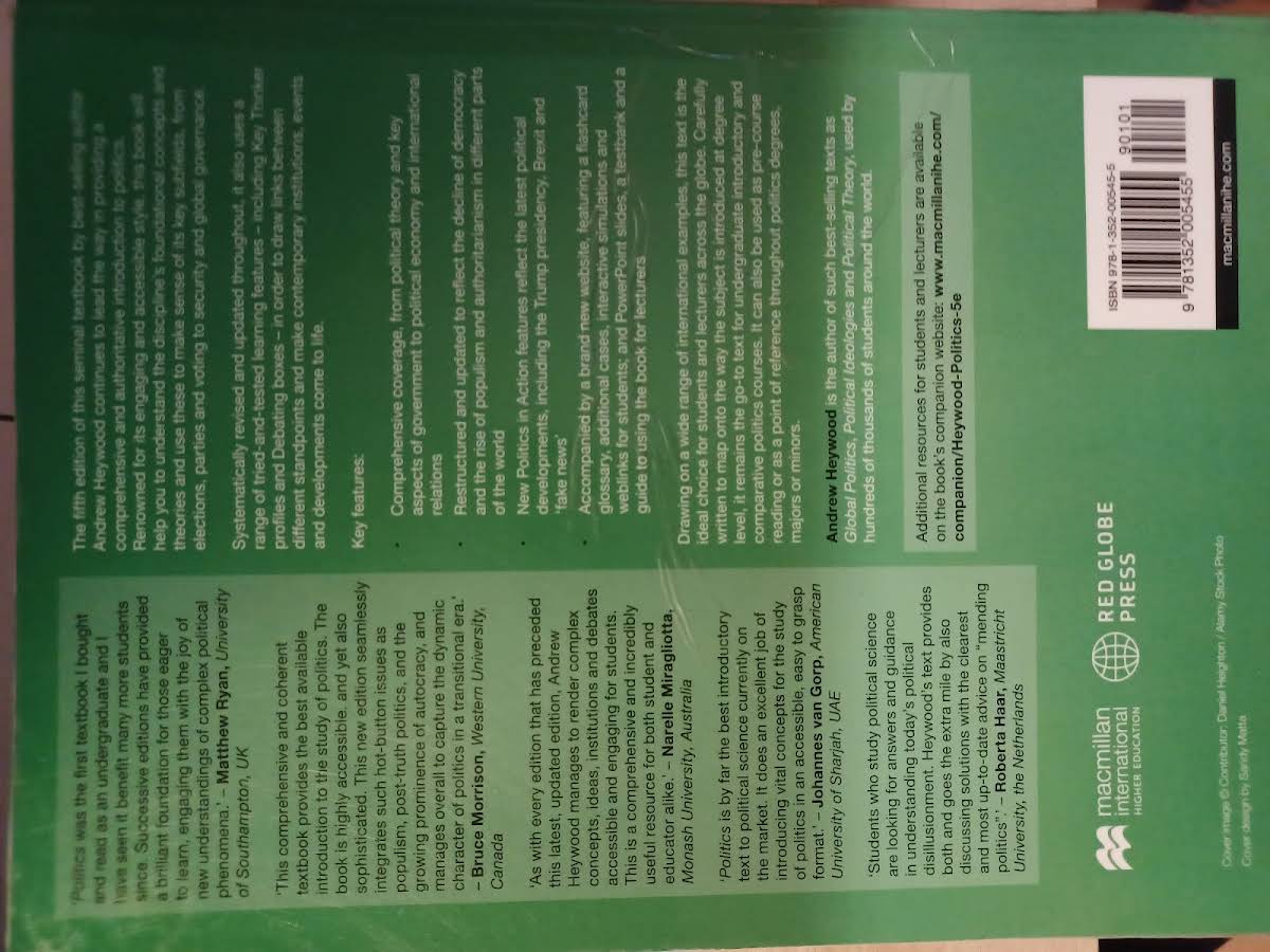 The fifth edition of Politics by Andrew Heywood offers a comprehensive and accessible introduction to the study of political systems and ideas. Written in an engaging style, this authoritative text breaks down the discipline’s core concepts and theories while guiding readers through key areas, from elections and voting to security and global governance. Carefully updated and restructured, this edition reflects contemporary challenges such as the shifting nature of democracy and the impact of evolving media landscapes. A wealth of international examples and a range of pedagogical features help to illuminate the links between diverse political standpoints, making complex ideas come alive. Designed to align with degree-level teaching in politics, this text is an ideal resource for both introductory and comparative political studies. It serves well as essential pre-course reading as well as a valuable reference throughout politics degrees, majors, or minors.
