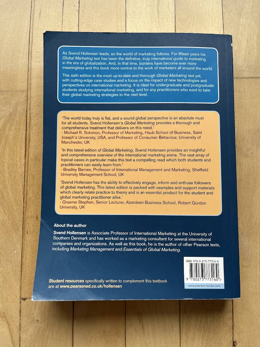 Global Marketing by Svend Hollensen provides an in-depth exploration of how companies engage in international markets. It examines the pivotal role of customers, producers, suppliers, and other stakeholders in shaping a global marketing process that spans diverse regions. The book presents a truly international approach by drawing on examples and case studies from Europe, the Middle East, Africa, the Far East, and the Americas. With its careful balance of theory and practical insights, Global Marketing highlights how real-world marketing decisions are made on a global scale, offering readers a comprehensive view of modern international marketing strategies.