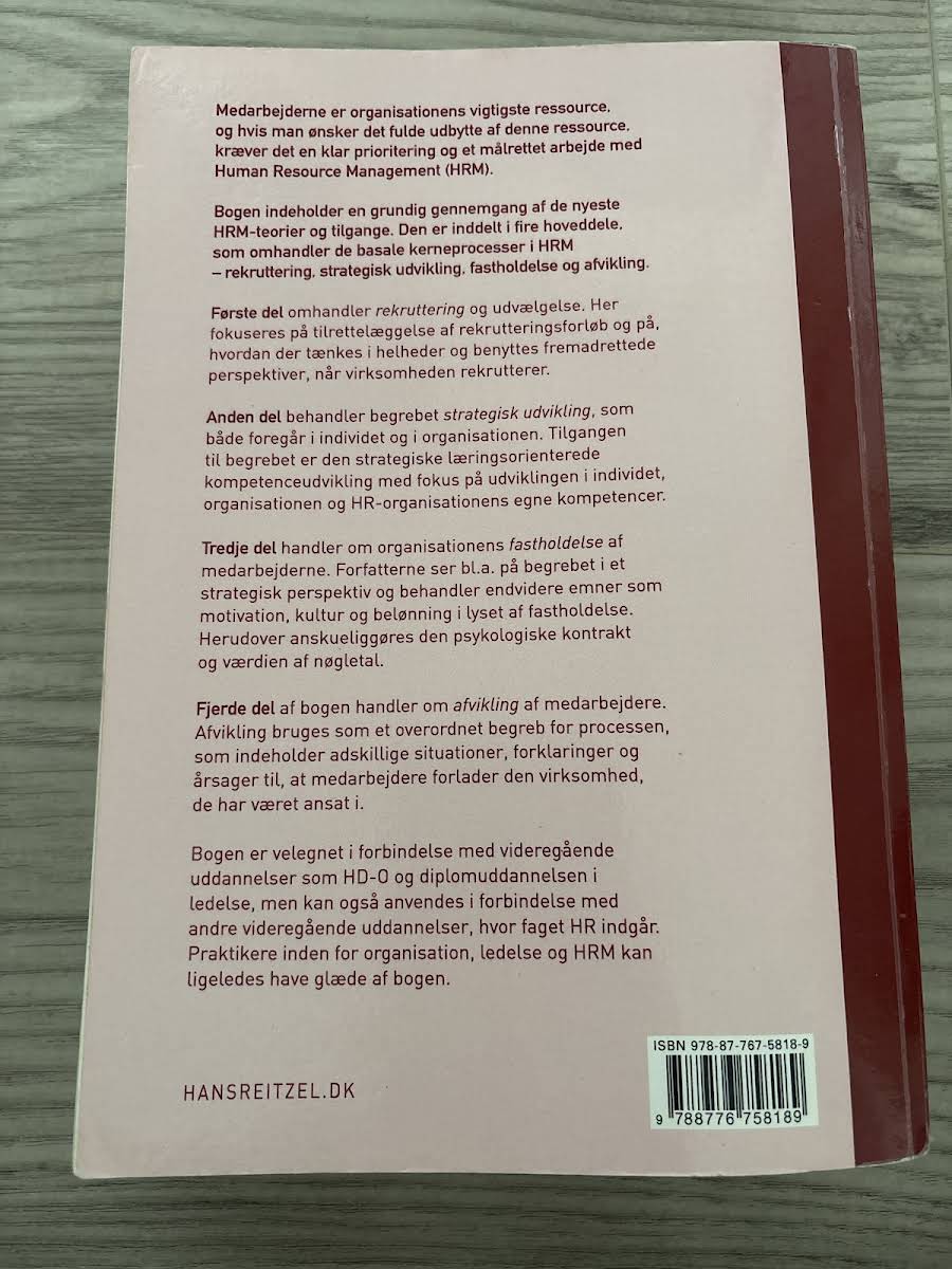 "Human resource management" byder på en dybdegående analyse af samspillet mellem medarbejdere, ledere, arbejdsopgaver og virksomhedens strategiske retning. Bogen er inddividueret i fire centrale dele, som hver især omhandler de essentielle HRM-processer: rekruttering, strategisk udvikling, fastholdelse og afvikling. Med et let tilgængeligt sprog henvender bogen sig primært til studerende inden for ledelse og HR, men den egner sig også ideelt til andre studieretninger, hvor faget HR indgår. Med sine 504 sider giver dette værk et solidt fundament og en nuanceret forståelse af de moderne teorier og metoder inden for human resource management.