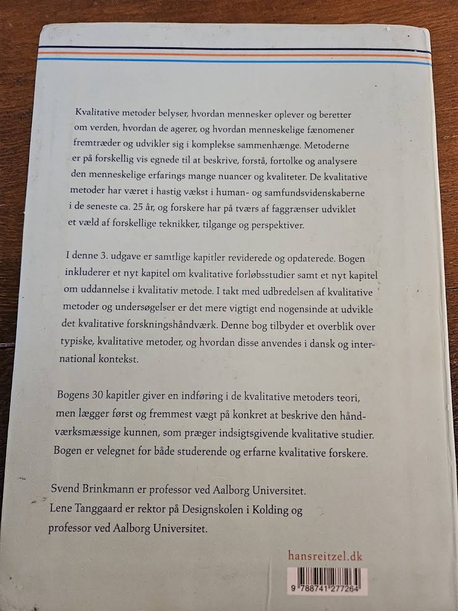 Kvalitative metoder – En grundbog giver en grundlæggende introduktion til, hvordan menneskers oplevelser og fortællinger kan beskrives, forstås og analyseres. Bogen illustrerer, hvordan kvalitative tilgange belyser de mange nuancer i den menneskelige erfarings verden og de komplekse sammenhænge, som præger vores dagligdag. I denne tredje udgave er samtlige kapitler reviderede og opdaterede for at afspejle den hastige udvikling inden for feltet. Blandt de nye tilføjelser finder vi et kapitel om kvalitative forløbsstudier samt et om uddannelse i den kvalitative metode, der understøtter en fornyet forståelse af forskningshåndværket. Med sine 30 kapitler præsenterer bogen både teoretiske perspektiver og praktiske metoder, som gør den til et uundværligt redskab for studerende og erfarne forskere, der ønsker at styrke deres kvalitative arbejdsmetoder.