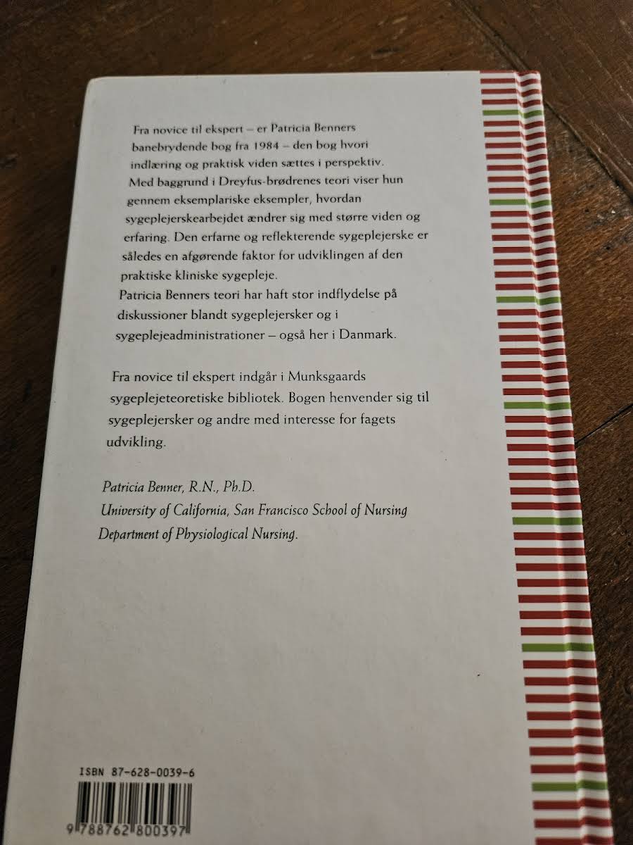 I "Fra novice til ekspert – mesterlighed og styrke i klinisk sygeplejepraksis" udforsker Patricia Benner den forvandlende rejse fra begynder til mester, hvor hver praksissituation bidrager til at forme den faglige udvikling. Gennem en dybdegående analyse af virkelighedstro sygeplejeeksempler præsenterer forfatteren de centrale elementer, der karakteriserer ekspertise i klinisk sygepleje. Bogen har en teoretisk forankring i både fænomenologisk tilgang og Dreyfuss' teori om kompetenceniveauer, hvilket understreger vigtigheden af erfaringsbaseret indlæring. Med sine 212 sider tilbyder bogen et indsigtsfuldt perspektiv, der kan stimulere både studerende og erfarne sygeplejersker til at reflektere over og videreudvikle deres kliniske praksis. Benner formidler på elegant vis, hvordan dygtighed og mesterlighed gradvist opnås gennem en kombination af teoretisk forståelse og praktisk erfaring, hvilket gør denne udgivelse til en uundværlig ressource for alle, der stræber efter faglig fornyelse og udvikling.