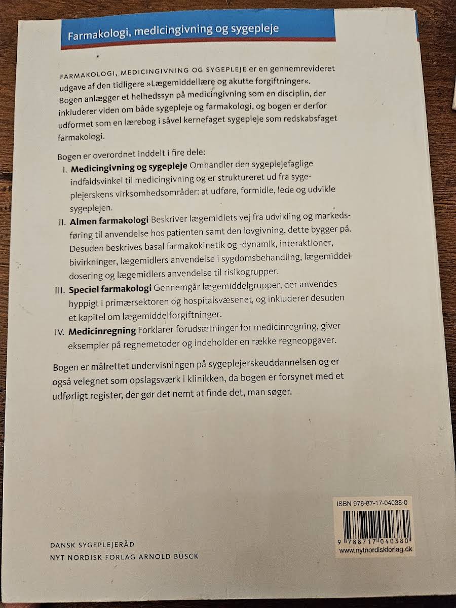 "Farmakologi, medicingivning og sygepleje" er et omhyggeligt revideret fagligt værk af Iben Lovring, Hanne Rasmussen, Gesche Jürgens, Lene Ørskov Reuther og Vivi Brandt Rasmussen. Værket bygger videre på tidligere udgaver og byder på opdateret indhold samt nye kapitler, der alle styrker læserens forståelse for de centrale principper i farmakologi og medicingivning. Bogen er struktureret i fire klart definerede sektioner, hvor den første del introducerer de grundlæggende metoder og tilgange i forbindelse med administration af medicin i sygeplejen. Efterfølgende dykker den anden del ned i den generelle farmakologi, mens den tredje udvider perspektivet med fokus på den specialiserede farmakologi. Det fjerde og sidste afsnit udgør et nyt tiltag, hvor der blandt andet præsenteres et dedikeret kapitel om medicinregning samt praktiske regneopgaver. Med sin omfattende opdeling og opdaterede indhold er bogen et uundværligt redskab for både studerende og praktiserende sygegeplejersker, der ønsker en dybdegående og anvendelsesorienteret tilgang til faget.