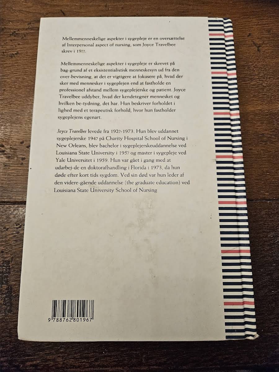 Mellemmenneskelige aspekter i sygepleje er en dansk oversættelse af Joyce Travelbees banebrydende værk Interpersonal aspect of nursing, der oprindeligt blev udgivet i 1966. Bogen er forankret i et eksistentialistisk menneskesyn, hvor fokus ligger på det levende møde mellem sygeplejerske og patient. I stedet for at opretholde en fast professionel afstand, giver Travelbee plads til, at den menneskelige kontakt og det terapeutiske forhold får hovedrollen. Med sin dybdegående tilgang kaster bogen lys over, hvordan de interpersonelle relationer kan berige sygeplejen. Joyce Travelbee formidler med indsigt, hvorfor det er essentielt at se individets erfaringer og behov i centrum for plejen, og hvordan dette perspektiv bidrager til sygeplejens unikke identitet. Denne første udgave fra 2002 inviterer læseren til en refleksion over, hvad det vil sige at levere omsorg med både hjerte og fornuft.