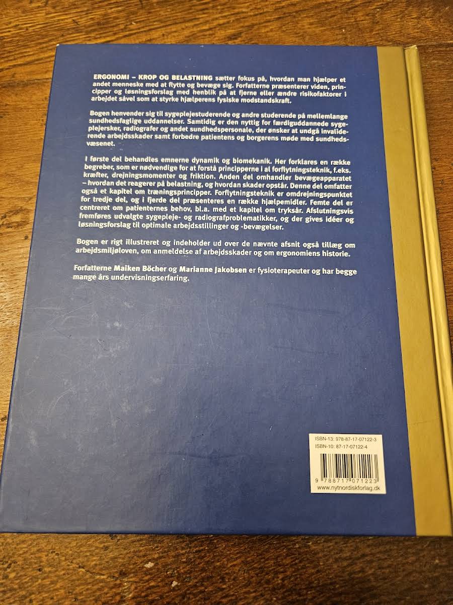 Ergonomi - krop og belastning giver en grundig indføring i, hvordan man sikrer sikker og effektiv forflytning af patienter og borgere. Bogen adresserer behovet for opdateret viden om ergonomiske principper, der både mindsker risikoen for belastningsskader og styrker hjælperens fysiske modstandskraft. I de første afsnit introduceres centrale begreber inden for dynamik og biomekanik. Læseren præsenteres for essentielle elementer såsom kræfter, drejningsmomenter og friktion, som er afgørende for forståelsen af de principper, der ligger til grund for sikre forflytningsteknikker. Efterfølgende behandles bevægeapparatet og dets reaktion på fysisk belastning, herunder hvordan skader opstår og kan forebygges med målrettede træningsprincipper. Senere fokuserer bogen på praktiske metoder og hjælpemidler, der understøtter den korrekte håndtering af patienter. Her gives der desuden konkrete eksempler og forslag til optimering af arbejdsstillinger og bevægelser, således at både studerende og erfarne sundhedsprofessionelle kan drage fordel af de præsenterede løsninger. Med rige illustrationer og supplerende afsnit om emner som arbejdsmiljølovgivning og ergonomiens historie, er denne udgave af bogen skrevet af de erfarne fysioterapeuter Maiken Böcher og Marianne Jakobsen et uundværligt redskab til alle, der ønsker at fremme en sikker og bæredygtig arbejdspraksis.