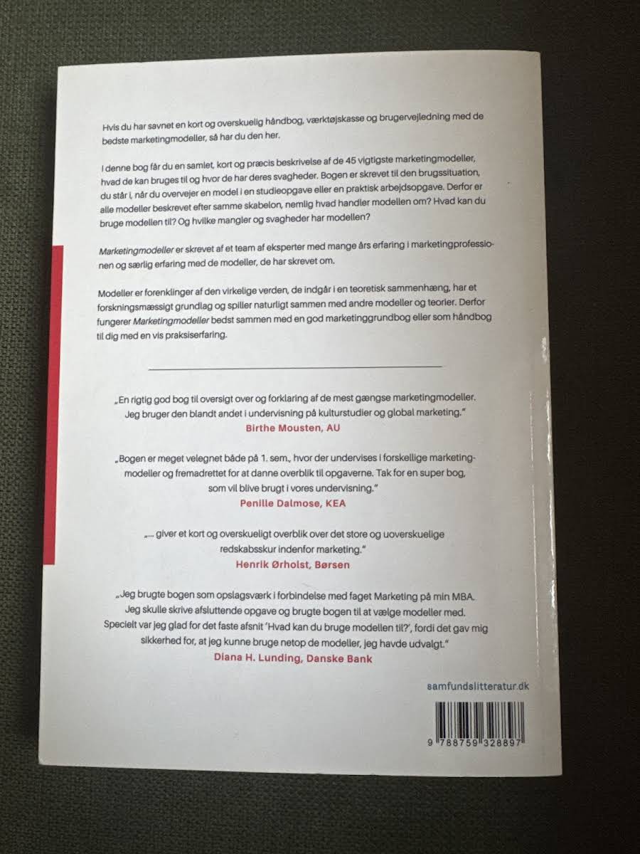 "Marketingmodeller" er en praktisk og overskuelig håndbog, der samler de 45 mest centrale marketingmodeller. Bogen præsenterer hver model kort og præcist med fokus på, hvad den handler om, hvordan den kan anvendes, og hvilke begrænsninger den måtte have. Denne tilgang gør den velegnet til både studieopgaver og praktiske arbejdssituationer. Redigeret af Kim Buch-Madsen trækker bogen på mange års erfaring fra marketingfeltet, og hver model beskrives med et skarpt blik på teori og praksis. Håndbogen fungerer optimalt som et supplement til en grundlæggende marketinglitteratur eller som et værktøj for dig med erfaring inden for faget, der ønsker et hurtigt overblik over modellernes muligheder og svagheder.