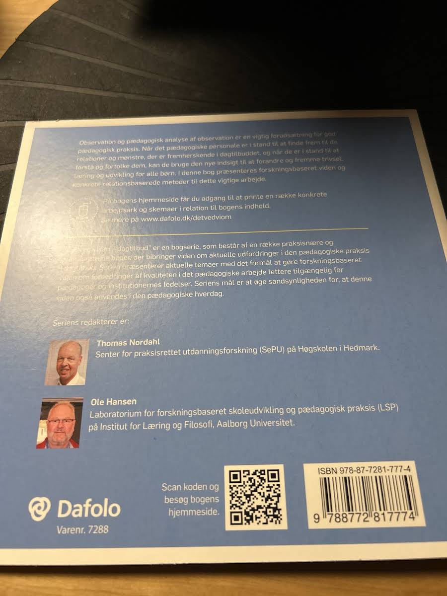 "Det ved vi om observation og pædagogisk analyse" giver pædagoger og studerende et værdifuldt redskab til at omsætte observationer til meningsfuld praksis. Gennem en struktureret tilgang lærer læseren at identificere og analysere de relationer og mønstre, som er centrale for at fremme trivsel, læring og udvikling blandt børn. Med udgangspunkt i forskning og konkrete relationsteoretiske metoder præsenterer bogen en praksisnær vejledning til det pædagogiske arbejde. Bogen, der er udgivet af Dafolo i 2013, tilbyder et solidt fundament for den daglige pædagogiske praksis. Ved at opbygge en dybere forståelse for, hvordan observationer kan analyseres, bliver det muligt at skabe positive forandringer i institutioner. Med sine 60 sider er bogen et overskueligt og inspirerende redskab, som både kan anvendes i praksis og som en del af den faglige uddannelse.