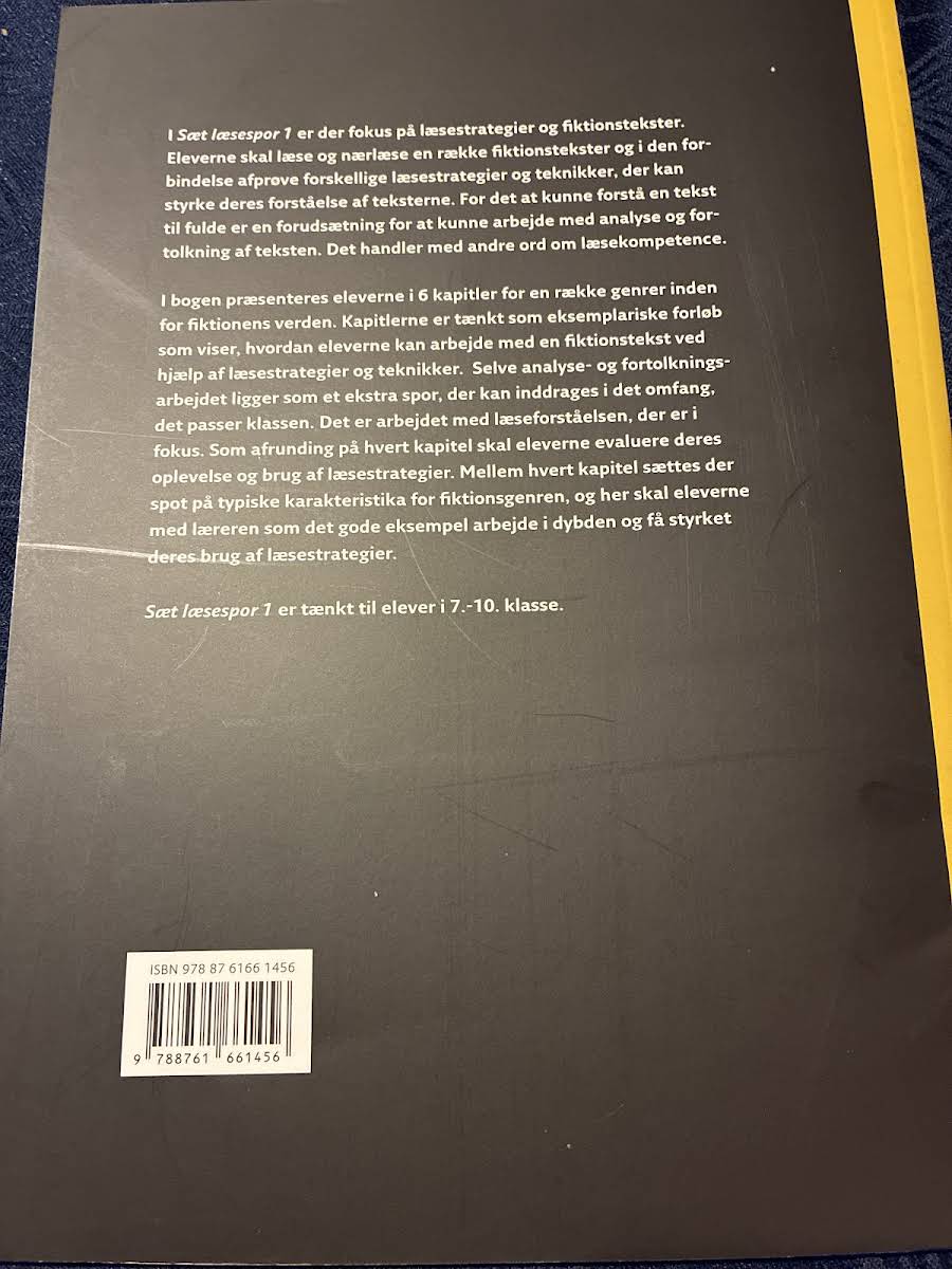 I "Sæt læsespor. Læsestrategier og fiktive tekster" er fokus rettet mod at styrke læsekompetencen hos eleverne ved at arbejde med fiktionelle tekster gennem målrettede læsestrategier og teknikker. Bogen præsenterer seks kapitler, der hver især udforsker forskellige fiktionelle genrer og illustrerer, hvordan målrettet læsning kan omsættes til praksis. Hvert kapitel afsluttes med en refleksionsøvelse, hvor eleverne evaluerer deres egne strategier og oplevelser med teksten. Desuden fremhæver bogen, mellem kapitlerne, centrale karakteristika for de enkelte genrer, så eleverne i samarbejde med læreren kan fordybe sig yderligere i forståelsen af litteraturens mange facetter.