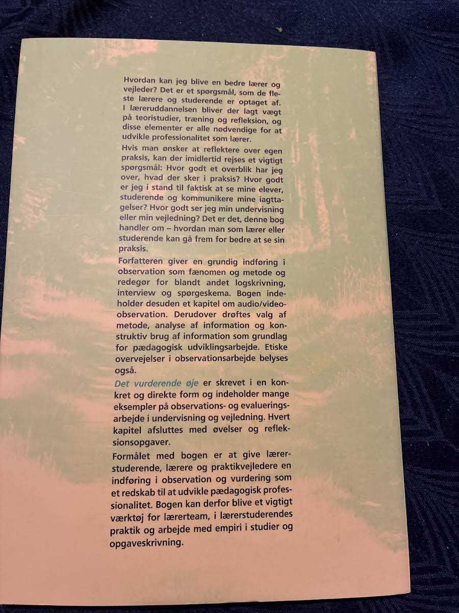 Hvordan kan man udvikle sit kritiske blik i mødet med læring og evaluering? I "Det vurderende øje" inviterer Cato R. P. Bjørndal til at udforske sammenhængen mellem teori, træning og refleksion – elementer, der alle er med til at sætte spor på den faglige professionalitet. Bogen bygger på en tænkende tilgang, hvor ideen om en aktiv vurdering af undervisningspraksis står centralt. Gennem en engagerende og nærværende fremstilling opfordres både undervisere og studerende til at reflektere over, hvordan et skærpet vurderende øje kan bidrage til en dybere forståelse af læringssituationer. Med sine 159 sider byder udgaven fra 2003 på et friskt perspektiv, der understreger vigtigheden af løbende faglig udvikling og personlig indsigt i uddannelsessammenhænge.
