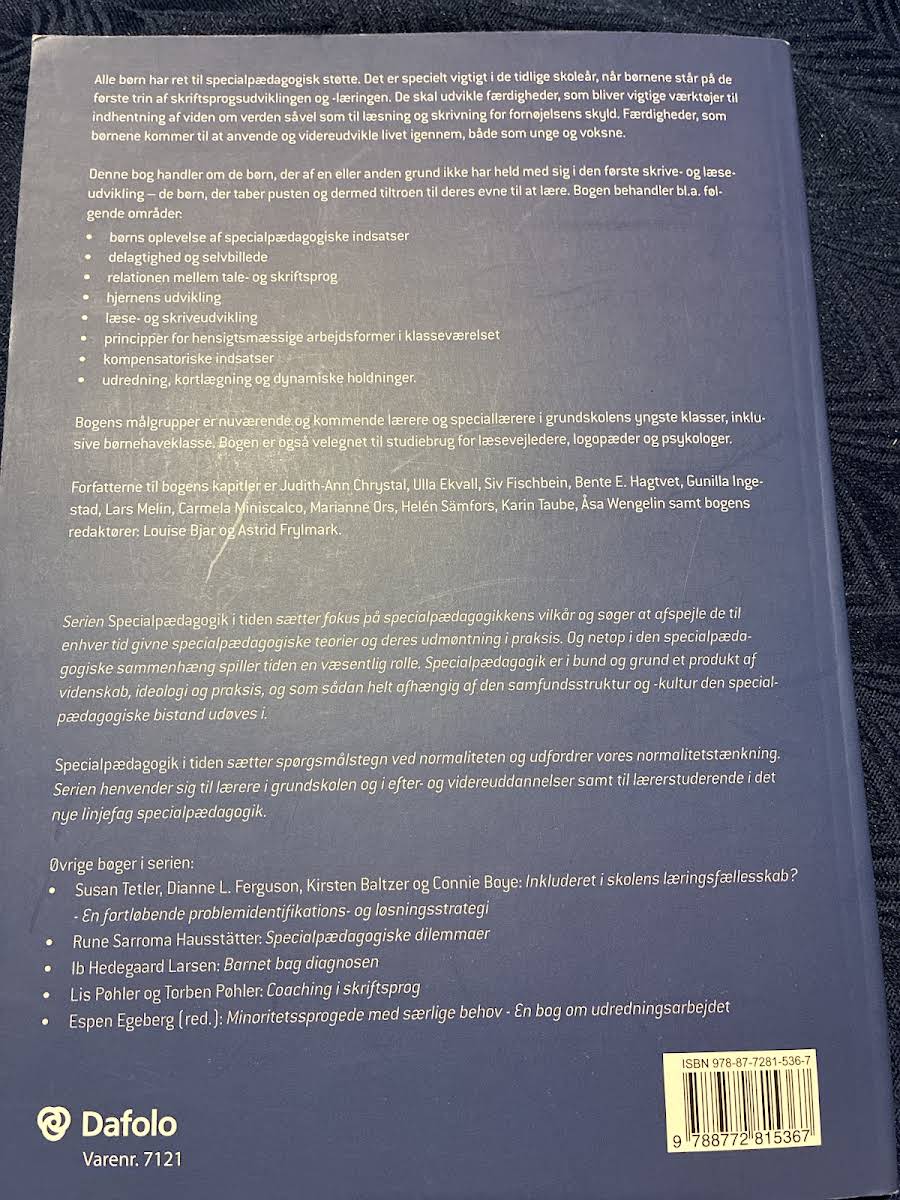 "Børn læser og skriver – specialpædagogiske perspektiver" er en faglig ressource, der retter sig mod lærere og andre professionelle, som arbejder med børn i de tidlige skoleår. Bogen adresserer de udfordringer, som nogle børn oplever, når de skal lære at læse og skrive, og den understreger betydningen af specialpædagogisk støtte i arbejdet med skriftsprogsudvikling. Gennem bogen præsenteres centrale emner såsom hjernens udvikling, den samlede læse- og skriveudvikling samt relationen mellem tale- og skriftsprog. Judith-Ann Chrystal giver vejledning og indsigter, som kan bidrage til en målrettet indsats over for elever, der har særlige behov, og understreger, hvordan tidlig specialpædagogik kan styrke børns selvtillid og fastholdelse af læse- og skriveprocessen. Publiseret af Dafolo i 2011 og trykt i paperback-format, tilbyder "Børn læser og skriver – specialpædagogiske perspektiver" et værdifuldt bidrag til det pædagogiske arbejde med alle børn, der har ret til den nødvendige støtte i de formende år.