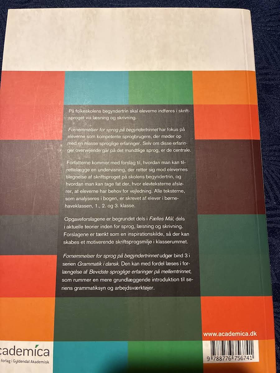 "Fornemmelser for sprog på begyndertrinnet" retter sig mod dansklærere med en videregående uddannelse samt lærerstuderende, der ønsker at fordybe sig i grammatikundervisningen i dansk på de tidlige skoletrin. Bogen belyser, hvordan læreren kan arbejde med centrale grammatiske begreber og inddrage elevernes allerede eksisterende sprogkompetencer, så de bedst muligt kan udvikle deres skriftsprog. Med en samling af analysetekster, der er skrevet af elever fra børnehaveklassen til 3. klasse, giver forfatterne konkrete eksempler på, hvordan undervisningen kan bygges op omkring den enkelte elevs sproglige erfaringer. Opgaverne, der er forankret i både Fælles Mål og gældende teorier om sprog, læsning og skrivning, tjener som inspiration til at skabe et engageret og støttende læringsmiljø i klassen. Som tredje bind i serien "Grammatik i dansk" supplerer bogen andre værker i serien ved at bygge videre på en introduktion til dansk grammatik og sprogforståelse. Denne bog giver både teoretiske og praktiske redskaber, som kan anvendes til at tilrettelægge en målrettet og differentieret undervisning på begyndertrinnet.