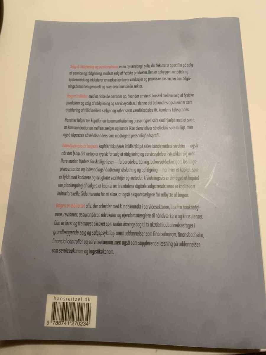 Salg er ligesom et håndværk, hvor de rette redskaber gør hele forskellen. I Salg af rådgivning og serviceydelser præsenterer Jens Lassen et omfattende perspektiv på, hvordan proaktivt salg og en velfyldt værktøjskasse giver sælgeren de bedste forudsætninger for at matche kundens behov og skabe værdifulde løsninger. Bogen fokuserer på, hvordan principper og metoder, der også anvendes i butikssalg inden for brancher som elektronik, vin, køkkener, badeværelser og autoværksteder, knytter ekspertrollen tæt sammen med rådgivende salgsteknikker. Bogen indledes med en klar afgrænsning af forskellene mellem salg af fysiske produkter og salg af rådgivning og serviceydelser, hvorefter de fundamentale elementer i en succesfuld salgsproces – forståelsen for kundens købsproces, værdiskabelse og tillid – udfoldes i detaljer. Herefter uddybes strukturen og de forskellige faser i kundemødet, inden kapitler om salgsplanlægning, personlig effektivitet og fremtidens digitale trends runder bogen af. Med sit indsigtsfulde indhold retter bogen sig primært mod studerende inden for finansøkonomi, serviceøkonomi og beslægtede uddannelser, men kan ligeledes anvendes som en værdifuld ressource på tværs af adskillige fagområder.