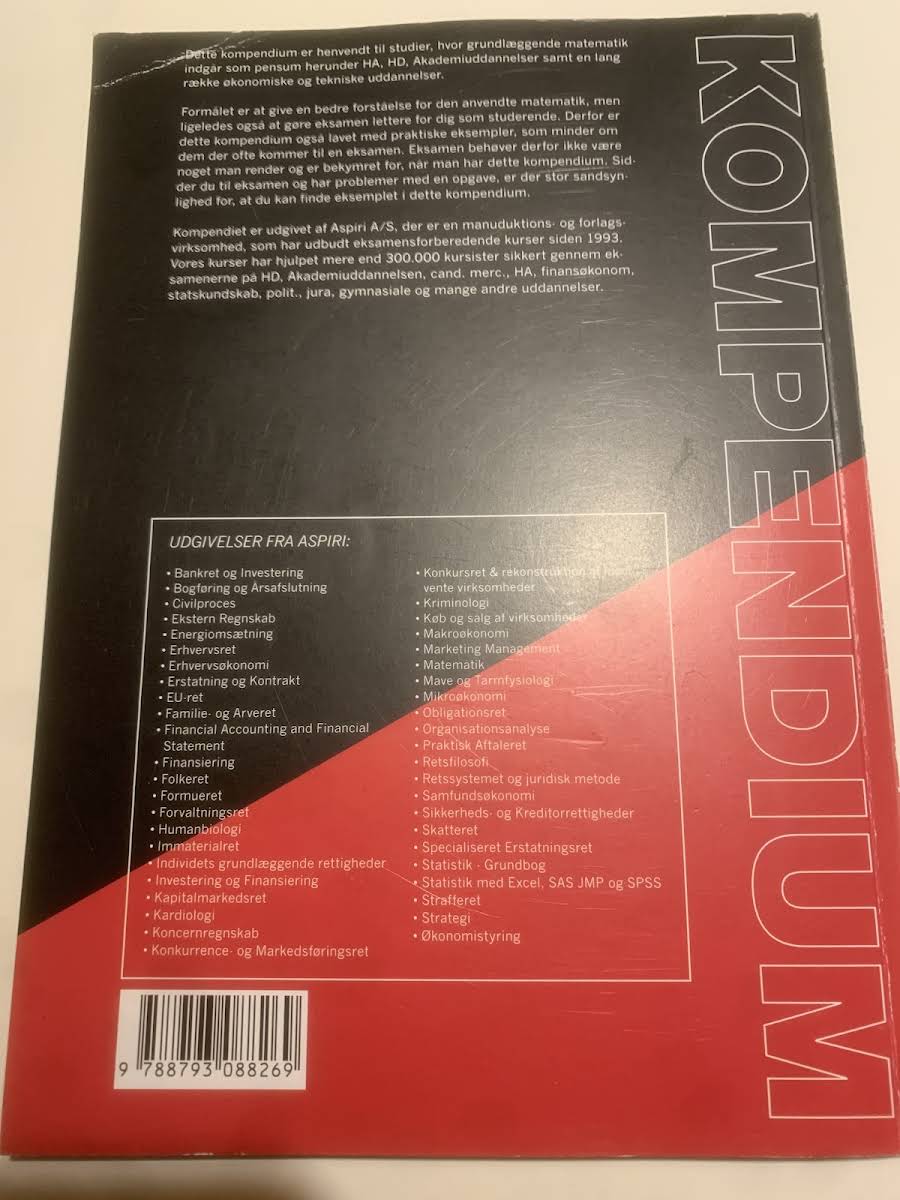 Dette kompendium henvender sig til studerende, der arbejder med matematik som led i deres pensum – herunder uddannelser som HA, HD, akademiuddannelser samt en lang række økonomiske og tekniske linjer. Bogen tilbyder en grundlæggende gennemgang af matematiske analyseredskaber med et stærkt fokus på praktiske eksempler, som afspejler de typiske opgavetyper, man møder til eksamen. Formålet med kompendiet er at gøre matematikken mere tilgængelig og overskuelig, så ud afordringerne bliver reduceret, når eksamen nærmer sig. Ved at gennemgå de væsentlige metoder og teknikker kan læseren hurtigt finde inspiration og løsninger, hvis en vanskelig opgave skulle opstå. Publikationen er udgivet af Aspiri og er udformet med den nødvendige faglige stringens og brugervenlighed, der skal sikre en optimal eksamensforberedelse.
