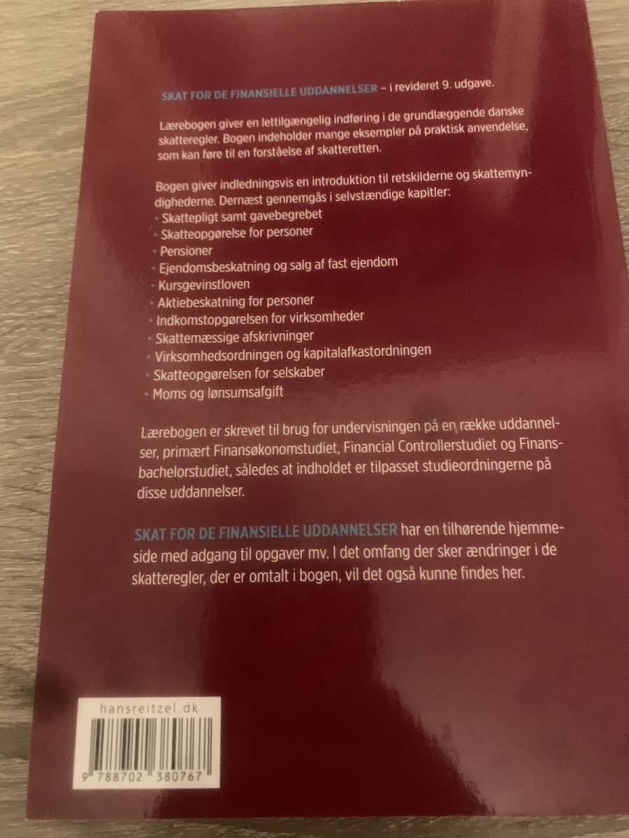 Lærebogens 9. udgave er opdateret med de nyeste ændringer i lovgivningen og præsenterer en overskuelig introduktion til de centrale danske skatteregler. Bogen er designet med henblik på undervisningen på flere finansielle uddannelser, herunder Finansøkonomstudiet, Financial Controller-studiet og Finansbachelorstudiet. Bogen starter med en grundig gennemgang af retskilder og de skattemyndigheder, som spiller en central rolle i skatteretten. Herefter uddybes emner som skattepligt, opgørelse af skat samt ejendomsbeskatning og salg af fast ejendom. Læseren får desuden indblik i kursgevinstloven og aktiebeskatning. Endvidere behandler bogen indkomstopgørelsen for virksomheder, skattemæssige afskrivninger, virksomhedsordningen og kapitalafkastordningen. Der gives også en klar introduktion til pensioner, moms og lønsumsafgift med mange praktiske eksempler, der gør det lettere at forstå og anvende skatteretlige principper i praksis.