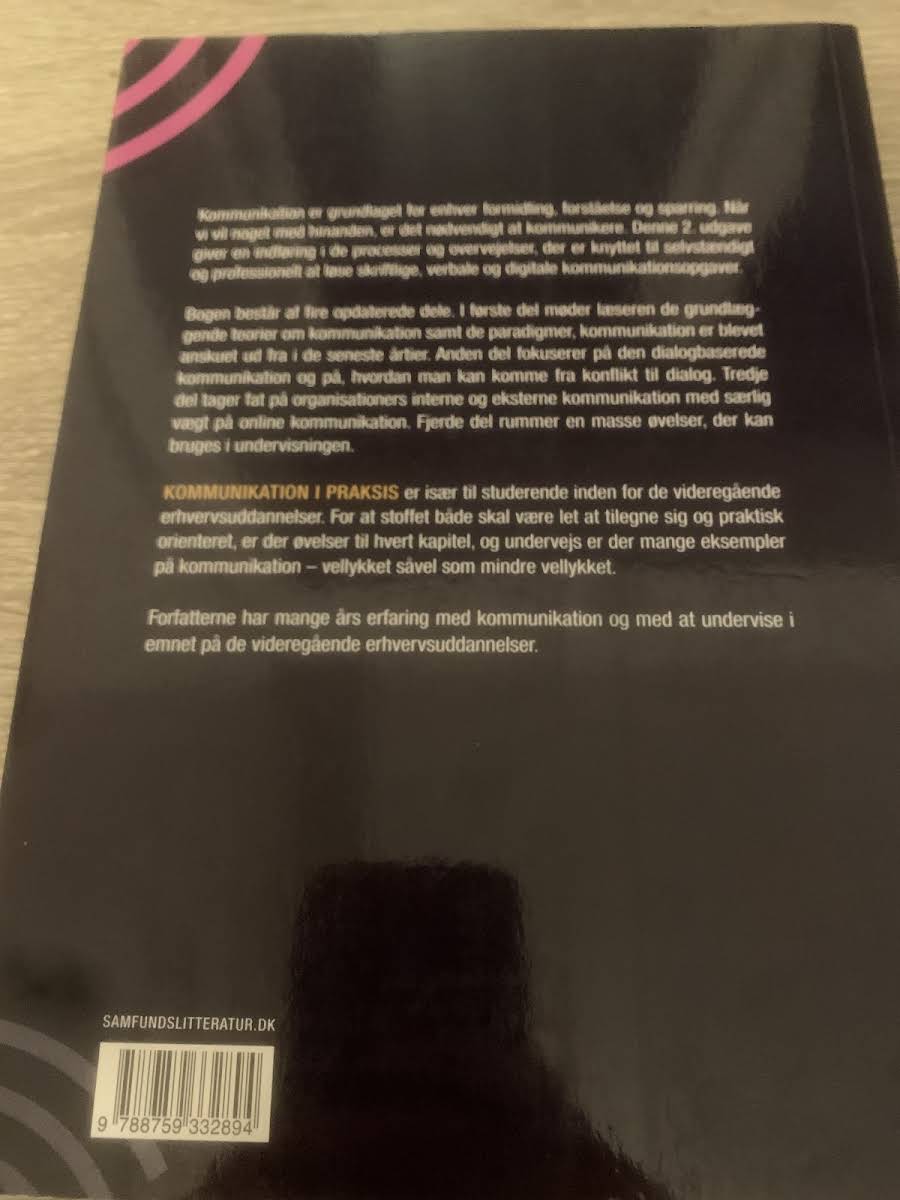 Kommunikation udgør kernen i al formidling, forståelse og interaktion. I denne 2. udgave af Kommunikation i praksis præsenteres de processer og overvejelser, der ligger til grund for en professionel håndtering af skriftlige, verbale og digitale kommunikationsopgaver. Bogen er struktureret i fire opdaterede dele. Den første del introducerer centrale teorier og paradigmer, der har præget kommunikationsfeltet i de seneste årtier. Herefter belyser den anden del den dialogbaserede kommunikation, og hvordan man effektivt bevæger sig fra konflikt til konstruktiv dialog. I tredje del sættes fokus på organisationers interne og eksterne kommunikation med særlig opmærksomhed på digitale platforme. Den fjerde del tilbyder et bredt udvalg af øvelser, som effektivt understøtter den praktiske anvendelse af stoffet i forhold til undervisning og læring. Kommunikation i praksis henvender sig især til studerende på videregående erhvervsuddannelser, og giver et let tilgængeligt og praksisorienteret indblik i kommunikationens mange facetter.