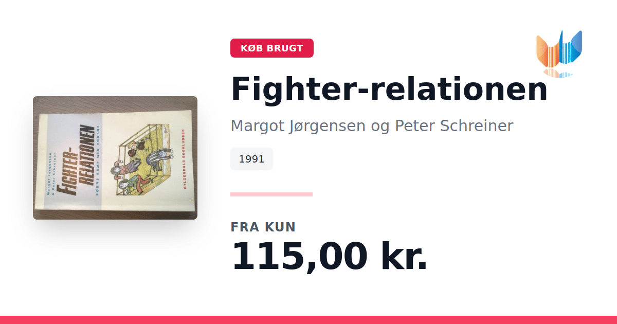 Lige nu kan du købe "Fighter-relationen" af Margot Jørgensen og Peter Schreiner til kun 115,00 kr. Bogen du ser her er brugt, og i god stand. Vi har i øjeblikket 2 eksemplarer til salg af "Fighter-relationen", så husk at se de forskellige udgaver.