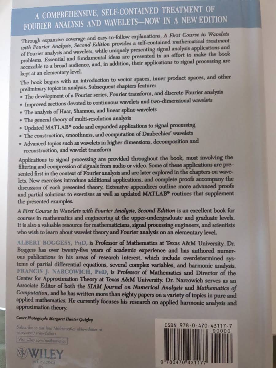 A First Course in Wavelets with Fourier Analysis, Second Edition offers a comprehensive and accessible treatment of Fourier analysis and wavelets. In this self-contained text, Albert Boggess presents fundamental concepts and techniques with clarity, ensuring that both mathematical theory and signal processing applications are approachable. The book opens with essential topics such as vector spaces and inner product spaces before developing the Fourier series, Fourier transform, and discrete Fourier analysis. The text further explores continuous wavelets, two-dimensional wavelets, and analyzes Haar, Shannon, and linear spline wavelets, along with the general framework of multi-resolution analysis. Enhanced with updated MATLAB code and expanded examples, the book guides the reader through the construction, smoothness, and computation of Daubechies' wavelets as well as advanced topics including wavelet decomposition and reconstruction. With its rigorous proofs, illustrative exercises, and detailed applications—often in the area of audio and video signal filtering and compression—this edition is particularly well-suited for upper-undergraduate and graduate courses in mathematics and engineering, as well as for professionals seeking a solid introduction to wavelet theory alongside Fourier analysis.