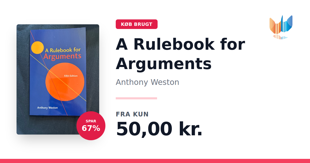Lige nu kan du købe "A Rulebook for Arguments" af Anthony Weston til kun 50,00 kr. Du sparer hele 67% af nyprisen! Bogen du ser her er brugt, og i perfekt stand. Vi har i øjeblikket kun et enkelt eksemplar til salg af "A Rulebook for Arguments", så slå til mens du kan!