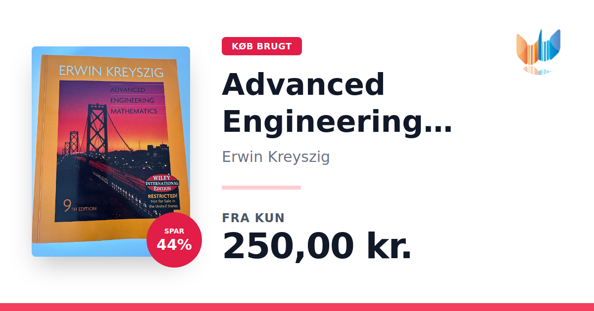 Lige nu kan du købe "Advanced Engineering Mathematics" af Erwin Kreyszig til kun 250,00 kr. Du sparer hele 44% af nyprisen! Bogen du ser her er brugt, og i perfekt stand. Vi har i øjeblikket 3 eksemplarer til salg af "Advanced Engineering Mathematics", så husk at se de forskellige udgaver.