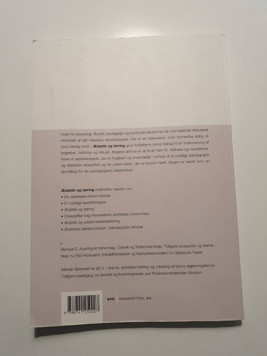 "Æstetik og læring" er en grundbog, der sætter fokus på de æstetiske læreprocesser og deres betydning i pædagogiske og didaktiske kontekster. Forfatterne Merete Sørensen og Bennyé D. Austring nærmer sig det brede og ofte komplekse begreb æstetik ved at belyse, hvordan sanselige, harmoniske, smukke og kunstneriske dimensioner alle spiller ind i den æstetiske erfaring og praksis. Med udgangspunkt i en lang tradition for diskussioner om det æstetiske, søger bogen at fastslå, definere og operationalisere et æstetikbegreb, som er gældende og anvendeligt for moderne uddannelsesinstitutioner. "Æstetik og læring" indeholder kapitler om de æstetiske ideers historie, et nutidigt æstetikbegreb, æstetik og læring, drivkræfter bag menneskets æstetiske virksomhed, æstetik og uddannelsestænkning samt æstetiske læreprocesser i pædagogisk arbejde.
