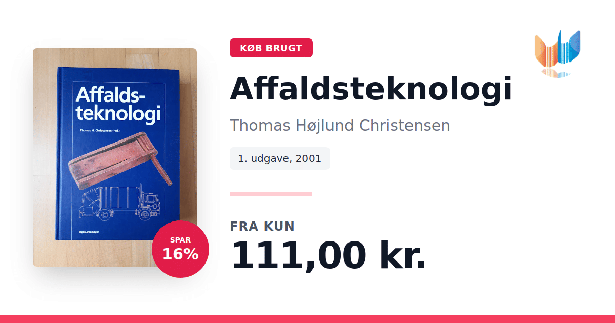 Lige nu kan du købe "Affaldsteknologi" af Thomas Højlund Christensen til kun 111,00 kr. Du sparer hele 16% af nyprisen! Bogen du ser her er brugt, og i perfekt stand. Vi har i øjeblikket kun et enkelt eksemplar til salg af "Affaldsteknologi", så slå til mens du kan!