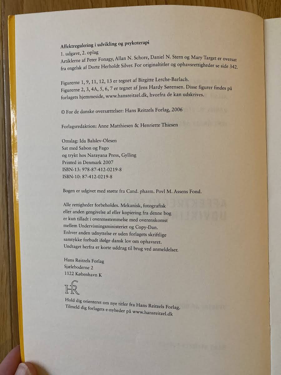 Affektregulering i udvikling og psykoterapi samler for første gang på dansk centrale artikler af tre førende forskere inden for tilknytningsteori og følelsesmæssig udvikling: Peter Fonagy, Allan N. Schore og Daniel N. Stern. Bogen giver et unikt indblik i, hvordan affektregulering former relationen mellem barn og omsorgsperson og mellem klient og terapeut. Gennem analyser af affekternes dynamik belyser forfatterne, hvordan evnen til at regulere følelser påvirker tilknytning, selvfølelsens opbygning samt både normal udvikling og psykiske vanskeligheder. Særligt fokus rettes mod implikationerne for behandling af personlighedsforstyrrelser, hvor affektregulering står centralt. Det omfattende introduktionskapitel af Jens Hardy Sørensen beskriver affekternes neurobiologiske grundlag og deres rolle i empatiudvikling og dynamisk psykoterapi. Hans indledende gennemgang skaber en solid ramme for forståelsen af de videnskabelige tekster, der følger. Bogen henvender sig til studerende og professionelle inden for psykologi, psykiatri, pædagogik og beslægtede fag, som arbejder med udvikling hos børn og voksne. Med sine 408 sider præsenterer den både teoretisk dybde og praktisk relevans. Gyldendal • 2006 • 1. udgave • 408 sider • Dansk