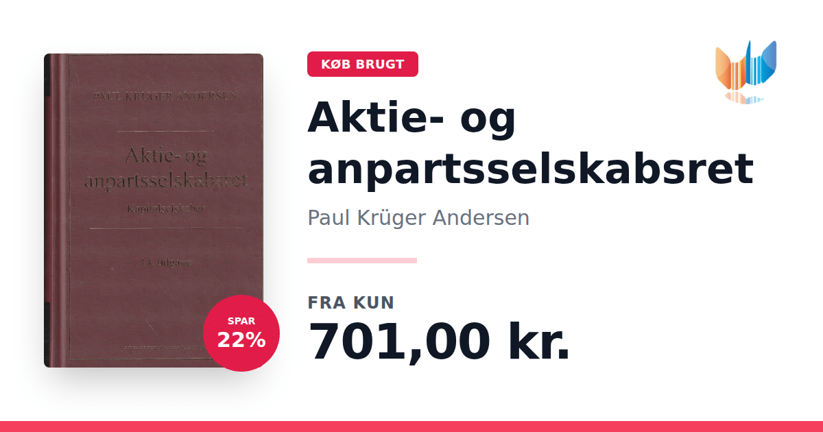 Lige nu kan du købe "Aktie- og anpartsselskabsret" af Paul Krüger Andersen til kun 701,00 kr. Du sparer hele 22% af nyprisen! Bogen du ser her er brugt, og i perfekt stand. Vi har i øjeblikket 4 eksemplarer til salg af "Aktie- og anpartsselskabsret", så husk at se de forskellige udgaver.