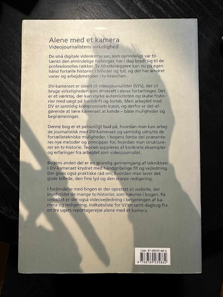 Små digitale videokameraer blev i sin tid skabt til det private forbrugermarked, men i dag bliver udstyret i høj grad brugt af professionelle. I *Alene med et kamera - Videojournalistens virkelighed* af Kristian Frederiksen foldes denne udvikling ud. Nutidens tv-tilrettelæggere kan nu helt på egen hånd skabe komplette historier med både lyd og levende billeder. Dette skift mod mere selvstændigt arbejde har haft en stor betydning, og det har ændret fundamentalt på arbejdsmetoderne og vanerne i hele tv-branchen.