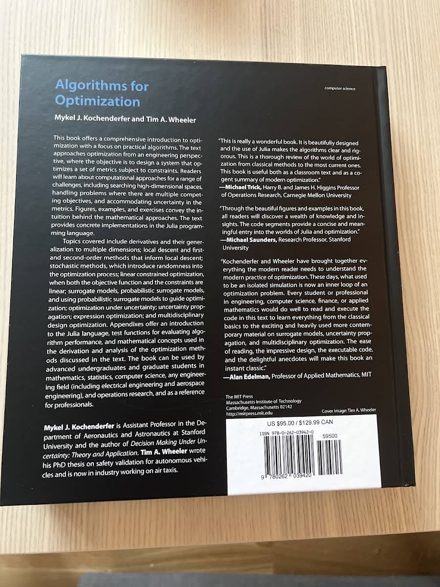 Algorithms for Optimization provides a thorough introduction to optimization with an emphasis on practical algorithms designed specifically for engineering systems. Framed from an engineering perspective, the book demonstrates how to design systems that optimize a set of metrics while satisfying various constraints. It carefully develops computational approaches to address challenges such as navigating high-dimensional spaces, balancing multiple competing objectives, and incorporating uncertainty into metrics. The text explores a range of topics including derivative-based methods, local descent techniques using first- and second-order approaches, and stochastic methods that introduce randomness to the optimization process. It also delves into linear constrained optimization as well as the use of surrogate models and probabilistic surrogates to guide decision-making under uncertainty. The inclusion of detailed figures, concrete examples, and exercises, alongside an appendix introducing the Julia language and key mathematical concepts, makes this work a valuable resource for advanced undergraduates, graduate students, and professionals in various fields.
