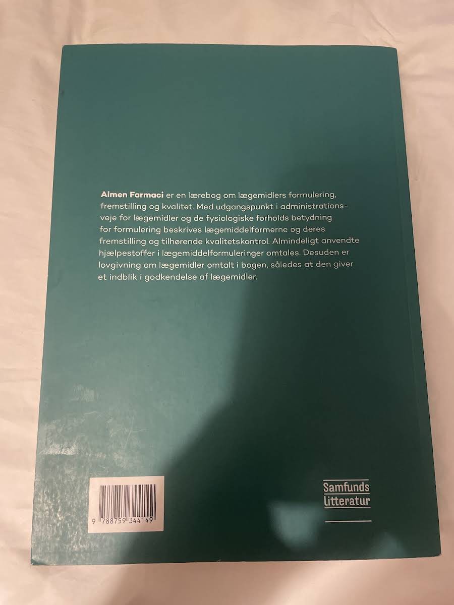 Almen Farmaci er en grundig lærebog om lægemidlers formulering, fremstilling og kvalitetsstyring. Med udgangspunkt i de forskellige administrationsveje og de fysiologiske faktorers betydning for formulering beskrives de relevante lægemiddelformer, deres fremstillingsprocesser og de tilhørende kvalitetskontroller. Bogen indeholder desuden en gennemgang af almindeligt anvendte hjælpestoffer i formuleringer samt en oversigt over lovgivning og godkendelsesprocedurer, så læseren får et samlet indblik i både de tekniske og regulatoriske aspekter af lægemiddeludvikling. I 5. udgave er kapitel 1 blevet redigeret med en opdateret introduktion til lægemidler, tilpasset den nye version af Jette Jacobsen. Kapitel 2 er væsentligt omarbejdet for at afspejle ændringer i det regulatoriske landskab, mens kapitlerne 3, 4, 5, 8 og 11 er opdateret på baggrund af feedback fra både kursusansvarlige og studerende på faget "Farmaci I" ved Institut for Farmaci. Desuden er afsnittene om isotoni i kapitel 23 og 26 revideret, efter at DLS 2023 ikke længere indeholder isotonitabellen, og udgaven afsluttes med et nyt, udvidet stikordsregister.