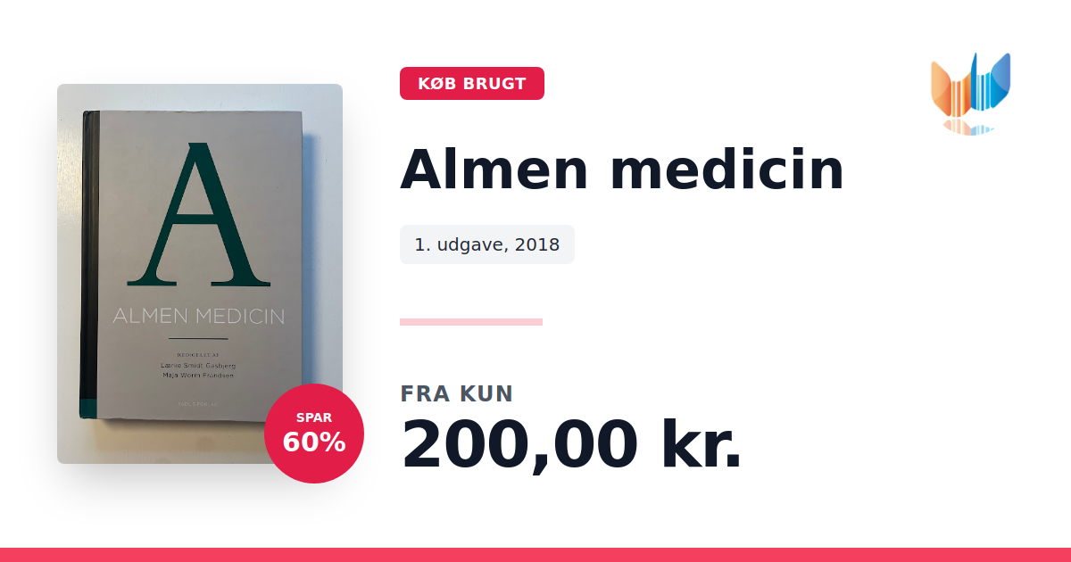 Almen medicin er en grundbog, der giver medicinstuderende og læger i klinisk basisuddannelse en detaljeret indføring i den danske primære sundhedssektor. Praktiserende læger udgør rygraden i sundhedsvæsenet, og over 85 % af befolkningen er årligt i kontakt med deres egen læge. Derfor er det essentielt at forstå både organiseringen, de daglige konsultationer og de mange facetterede patientmøder i almen praksis. Bogen gennemgår systematisk opbygningen af almen praksis, præsenterer metoder til diagnostik og konsultation og indeholder et særligt kapitel om kommunikation. Der sættes fokus på at udvikle de kommunikative evner og skabe trygge relationer, som er helt afgørende i mødet mellem læge og patient. Alle kapitler er skrevet af anerkendte eksperter med mange års erfaring. Almen medicin er redigeret af Lærke Smidt Gasbjerg og Maja Worm Frandsen og udkom i 2018 på FADL’s Forlag A/S som hardback i 1. udgave på 350 sider.