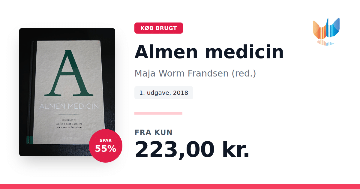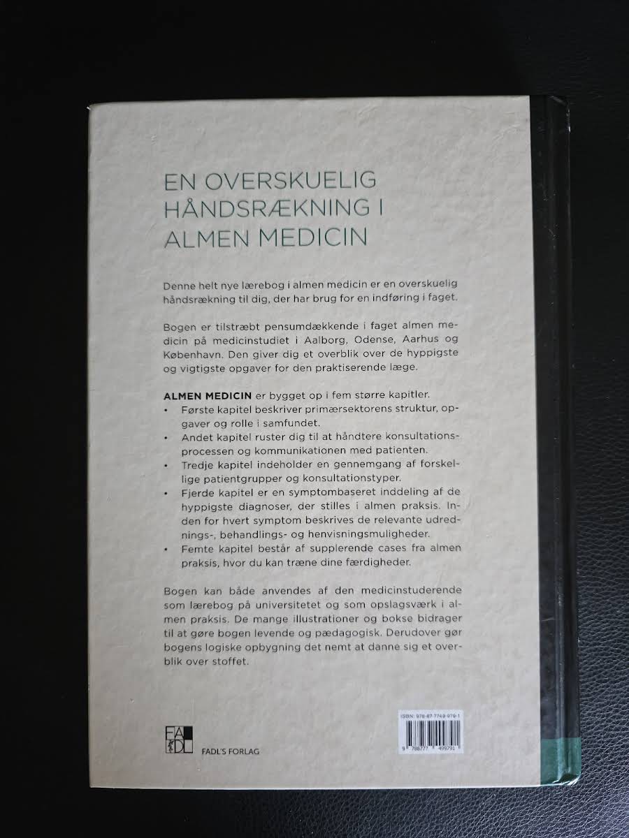 Almen medicin er en grundbog, der giver medicinstuderende og læger i klinisk basisuddannelse en detaljeret indføring i den danske primære sundhedssektor. Praktiserende læger udgør rygraden i sundhedsvæsenet, og over 85 % af befolkningen er årligt i kontakt med deres egen læge. Derfor er det essentielt at forstå både organiseringen, de daglige konsultationer og de mange facetterede patientmøder i almen praksis. Bogen gennemgår systematisk opbygningen af almen praksis, præsenterer metoder til diagnostik og konsultation og indeholder et særligt kapitel om kommunikation. Der sættes fokus på at udvikle de kommunikative evner og skabe trygge relationer, som er helt afgørende i mødet mellem læge og patient. Alle kapitler er skrevet af anerkendte eksperter med mange års erfaring. Almen medicin er redigeret af Lærke Smidt Gasbjerg og Maja Worm Frandsen og udkom i 2018 på FADL’s Forlag A/S som hardback i 1. udgave på 350 sider.