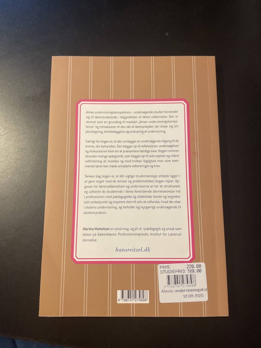 "Almen undervisningskompetence" af Martha Mottelson er en grundbog, der byder lærerstuderende velkommen til en dybdegående introduktion til centrale didaktiske og pædagogiske emner. Bogen, udgivet i 2019 af Hans Reitzels Forlag, fokuserer særligt på planlægning, tilrettelæggelse og evaluering af undervisning – centrale aspekter for den fremtidige lærer. Med et undersøgende udgangspunkt vækker bogen til refleksion og debat om de forskellige temaer, der præger undervisningsfaget. Gennem aktuelle spørgsmål og diskussionspunkter opfordres læseren til at analysere og engagere sig i de problemstillinger, som undervisningslivet rummer. "Almen undervisningskompetence" fungerer som et vigtigt redskab, der klæder de studerende på til den praktiske virkelighed i skolen, idet den både tilbyder teoretisk fundament og inspiration til, hvordan man som kommende lærer kan navigere i et komplekst fagområde.