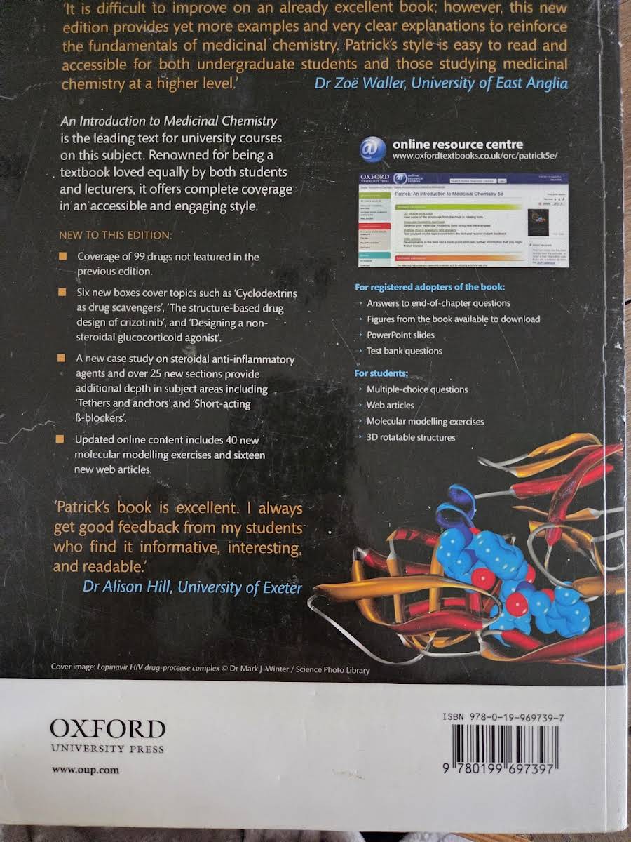 An Introduction to Medicinal Chemistry er den førende lærebog for universitetskurser i medicinalkemi. I sin 5. udgave fra Oxford University Press kombinerer Graham L. Patrick faglig tyngde med en tilgængelig og engagerende stil, som både studerende og undervisere sætter pris på. Bogen indleder med den nødvendige biokemi bag moderne lægemiddelforskning og introducerer struktur og funktion af centrale lægemiddelmål. Herefter følger en grundig gennemgang af, hvordan lægemidler interagerer med kroppen, og hvilke kemiske og biologiske konsekvenser disse interaktioner medfører. Dernæst dykker teksten ned i de overordnede strategier og principper for lægemiddelopdagelse og -design samt de vigtigste "værktøjer i faget". Afslutningsvis præsenteres udvalgte aktuelle emner inden for medicinalkemi som antivirale og antikræftmidler, kolinerge og antikolinesteraser samt midler mod mavesår. Rigeligt med læringsstøtte er indbygget: et fyldigt glosarium forklarer fagsprog, bokse giver dybdegående cases, nøglepunkter afrunder hvert afsnit, og opgaver i slutningen af hvert kapitel udfordrer forståelsen. Desuden følger et omfattende online-ressourcecenter med bl.a. løsningsforslag, figurer, PowerPoint-slides, multiple choice-spørgsmål, molmodellering og 3D-strukturer.