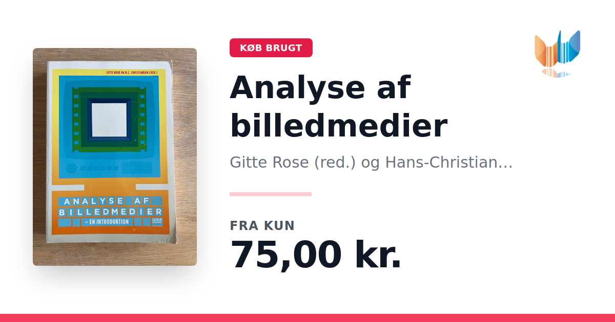 Lige nu kan du købe "Analyse af billedmedier" af Gitte Rose (red.) og Hans-Christian Christiansen (red.) til kun 75,00 kr. Bogen du ser her er brugt, og i god stand. Vi har i øjeblikket 6 eksemplarer til salg af "Analyse af billedmedier", så husk at se de forskellige udgaver.