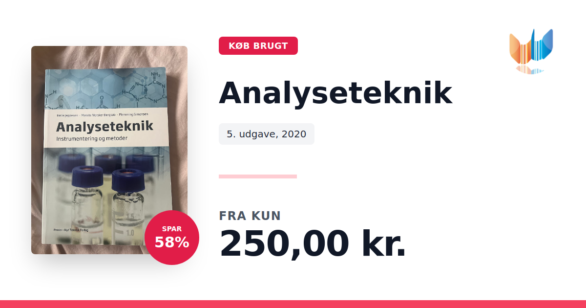 Analyseteknik - Instrumentering og metoder (5. udgave, 2020) giver en systematisk gennemgang af de væsentligste teknikker og apparaturer, der anvendes i et moderne analytisk laboratorium. Bogen introducerer principperne bag de centrale instrumentelle metoder og formidler teori og praksis i ét samlet værk. Indholdet er organiseret omkring de tre søjler i analytisk kemi: kromatografi, spektrometri og potentiometri. Hertil kommer kapitler om statistisk vurdering af resultater, metodevalidering samt kvalificering af udstyr. Desuden præsenteres en række basale redskaber til problemløsning og datahåndtering. Der lægges særlig vægt på den praktiske anvendelse, og hvert emne suppleres med laboratorierelevante beregningseksempler og øvelsesopgaver, som knytter teori tæt sammen med det daglige arbejde. Illustrationer og skematiske oversigter understøtter forståelsen af komplekse processer. Bogen er velegnet både som kursuslitteratur og som opslagsværk i laboratoriet. Den klare struktur og de selvstændige afsnit gør det nemt at finde netop det, man søger, uden at skulle læse forudgående kapitler.