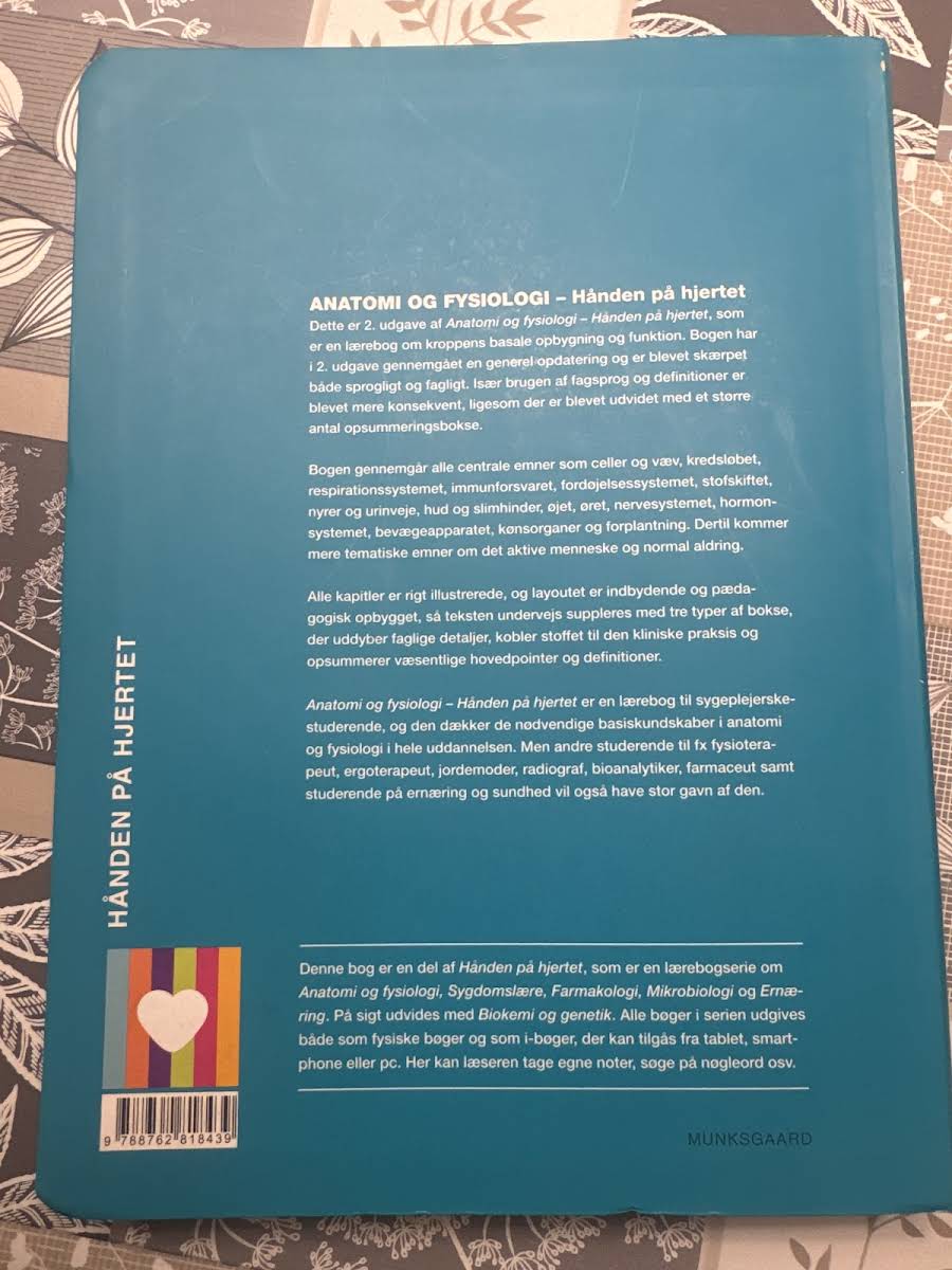 Anatomi og fysiologi – hånden på hjertet (2. udgave) giver en grundig og opdateret introduktion til kroppens struktur og funktion. Denne udgave har fået et skærpet sprog og konsekvent anvendelse af fagsprog og definitioner, der sikrer en klar og præcis formidling af stoffet. Bogen gennemgår alle centrale emner, herunder celler og væv, kredsløb, respirationssystemet, immunforsvaret, fordøjelsessystemet, stofskiftet, nyrer og urinveje, hud og slimhinder, øjet og øret, nervesystemet, hormonsystemet, bevægeapparatet samt kønsorganer og forplantning. Derudover berøres tematiske aspekter som det aktive menneske og normal aldring. Med rigt illustrerede kapitler og et indbydende layout, der understøttes af tre typer bokse til uddybning af faglige detaljer, knytter bogen teorien til klinisk praksis og opsummerer de vigtigste hovedpointer og definitioner. Trods sit primære fokus på sygeplejerskestuderende, vil også studerende inden for andre sundhedsprofessioner finde stor gavn af denne velstrukturerede lærebog.