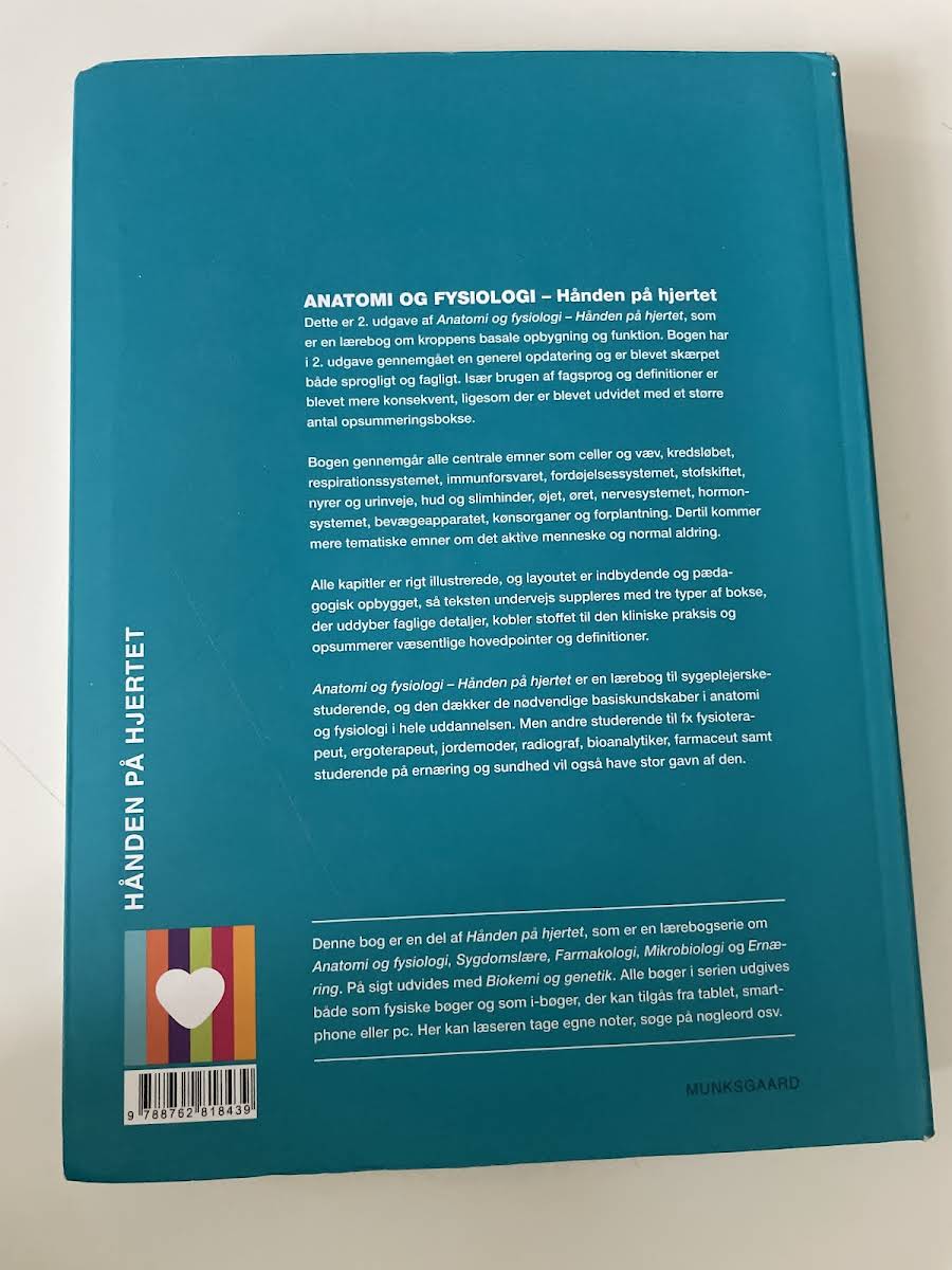 Anatomi og fysiologi – hånden på hjertet (2. udgave) giver en grundig og opdateret introduktion til kroppens struktur og funktion. Denne udgave har fået et skærpet sprog og konsekvent anvendelse af fagsprog og definitioner, der sikrer en klar og præcis formidling af stoffet. Bogen gennemgår alle centrale emner, herunder celler og væv, kredsløb, respirationssystemet, immunforsvaret, fordøjelsessystemet, stofskiftet, nyrer og urinveje, hud og slimhinder, øjet og øret, nervesystemet, hormonsystemet, bevægeapparatet samt kønsorganer og forplantning. Derudover berøres tematiske aspekter som det aktive menneske og normal aldring. Med rigt illustrerede kapitler og et indbydende layout, der understøttes af tre typer bokse til uddybning af faglige detaljer, knytter bogen teorien til klinisk praksis og opsummerer de vigtigste hovedpointer og definitioner. Trods sit primære fokus på sygeplejerskestuderende, vil også studerende inden for andre sundhedsprofessioner finde stor gavn af denne velstrukturerede lærebog.