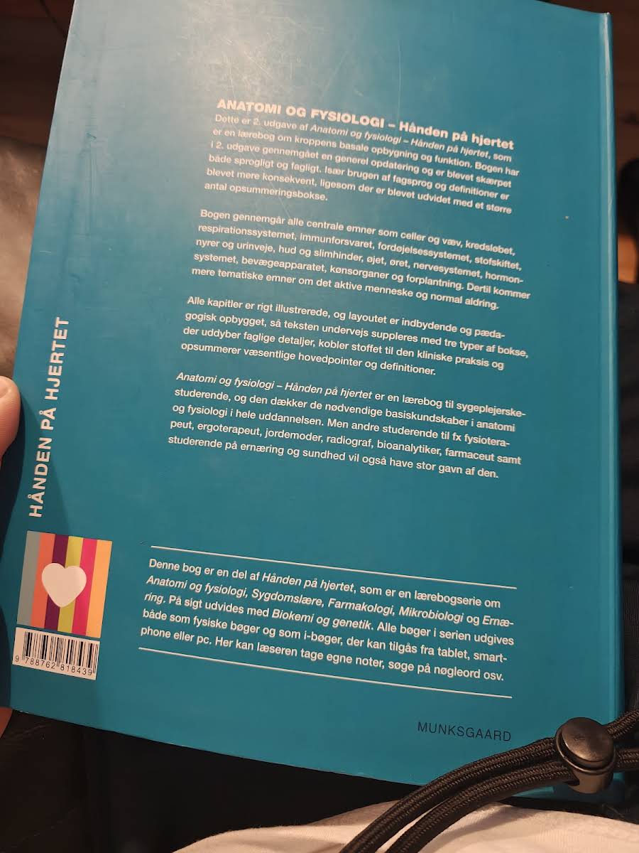 Anatomi og fysiologi – hånden på hjertet (2. udgave) giver en grundig og opdateret introduktion til kroppens struktur og funktion. Denne udgave har fået et skærpet sprog og konsekvent anvendelse af fagsprog og definitioner, der sikrer en klar og præcis formidling af stoffet. Bogen gennemgår alle centrale emner, herunder celler og væv, kredsløb, respirationssystemet, immunforsvaret, fordøjelsessystemet, stofskiftet, nyrer og urinveje, hud og slimhinder, øjet og øret, nervesystemet, hormonsystemet, bevægeapparatet samt kønsorganer og forplantning. Derudover berøres tematiske aspekter som det aktive menneske og normal aldring. Med rigt illustrerede kapitler og et indbydende layout, der understøttes af tre typer bokse til uddybning af faglige detaljer, knytter bogen teorien til klinisk praksis og opsummerer de vigtigste hovedpointer og definitioner. Trods sit primære fokus på sygeplejerskestuderende, vil også studerende inden for andre sundhedsprofessioner finde stor gavn af denne velstrukturerede lærebog.