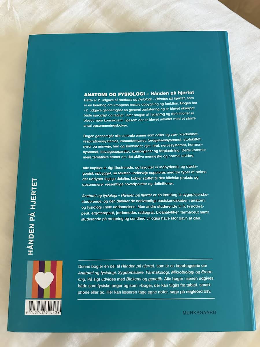 Anatomi og fysiologi – hånden på hjertet (2. udgave) giver en grundig og opdateret introduktion til kroppens struktur og funktion. Denne udgave har fået et skærpet sprog og konsekvent anvendelse af fagsprog og definitioner, der sikrer en klar og præcis formidling af stoffet. Bogen gennemgår alle centrale emner, herunder celler og væv, kredsløb, respirationssystemet, immunforsvaret, fordøjelsessystemet, stofskiftet, nyrer og urinveje, hud og slimhinder, øjet og øret, nervesystemet, hormonsystemet, bevægeapparatet samt kønsorganer og forplantning. Derudover berøres tematiske aspekter som det aktive menneske og normal aldring. Med rigt illustrerede kapitler og et indbydende layout, der understøttes af tre typer bokse til uddybning af faglige detaljer, knytter bogen teorien til klinisk praksis og opsummerer de vigtigste hovedpointer og definitioner. Trods sit primære fokus på sygeplejerskestuderende, vil også studerende inden for andre sundhedsprofessioner finde stor gavn af denne velstrukturerede lærebog.
