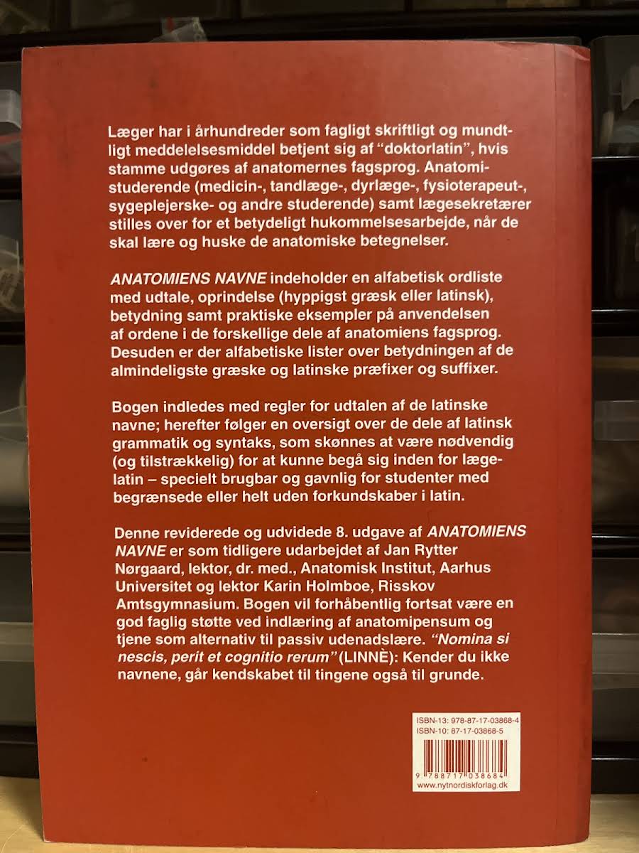 "Anatomiens navne" af Jan Rytter Nørgaard og Karin Holmboe præsenterer et overskueligt og velfunderet opslagsværk, der belyser oprindelsen og betydningen af betegnelserne inden for både makroskopisk og mikroskopisk anatomi samt embryologi. Bogen omdanner de latinske gloser til letforståelige danske forklaringer, hvilket gør det nemmere for studerende at fordybe sig i det anatomiske fagsprog. Med en alfabetisk ordning, der inkluderer udtale, oprindelse og praktiske eksempler, fungerer værket som et solidt redskab for studerende inden for bl.a. medicin, tandlæge, dyrlæge og sygepleje. Oversigter over de mest anvendte græske og latinske præfikser og suffikser understøtter den pædagogiske tilgang og skaber ro og orden i læringsprocessen. Bogen indeholder desuden en introduktion til latinsk udtale og giver et kort overblik over væsentlige regler inden for latinsk grammatik og syntaks. "Anatomiens navne" tilbyder således et praktisk og anvendeligt værktøj, der bidrager til en mere aktiv og forståelig tilgang til det omfattende anatomipensum.