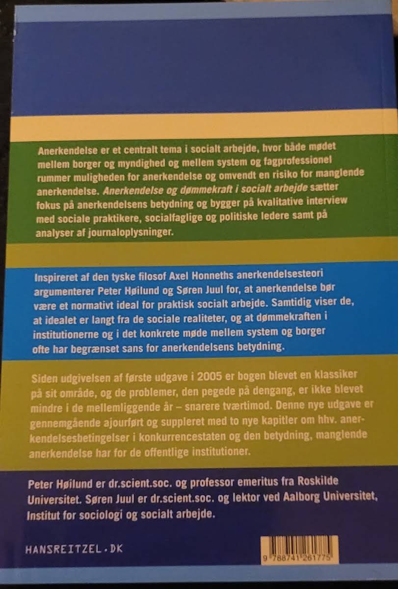 I socialt arbejde udgør anerkendelse et centralt element, både i mødet mellem borger og myndighed og i samspillet mellem system og fagprofessionelle. I "Anerkendelse og dømmekraft i socialt arbejde" sættes fokus på, hvordan anerkendelsens tilstedeværelse – og fraværet heraf – har afgørende betydning for den praktiske indsats. Gennem kvalitative interviews med sociale praktikere, socialfaglige og politiske ledere belyses, hvordan normativ forankring af anerkendelse kan udgøre et centralt ideal i det sociale arbejde. Med inspiration fra den tyske filosof Alex Honneth tager Peter Høilund og Søren Rudbæk Juul udgangspunkt i anerkendelsesteori for at understrege vigtigheden af dømmekraft i hver interaktion. Bogen udfolder, hvordan anerkendelse kan fungere som et redskab til at styrke relationer og understøtte beslutningsprocesser i sociale institutioner. På 192 sider præsenteres analyser og refleksioner, der tilsammen giver et nuanceret billede af de muligheder og begrænsninger, der præger det moderne sociale arbejde.