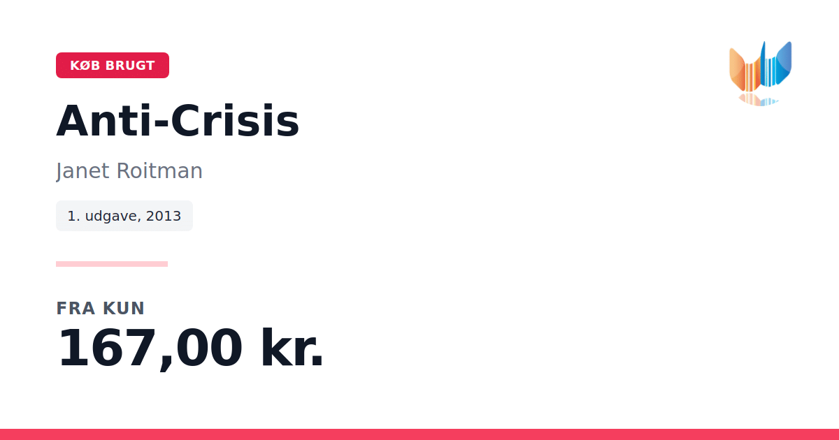 Lige nu kan du købe "Anti-Crisis" af Janet Roitman til kun 167,00 kr. Du sparer hele 14% af nyprisen! Bogen du ser her er brugt, og i god stand. Vi har i øjeblikket kun et enkelt eksemplar til salg af "Anti-Crisis", så slå til mens du kan!